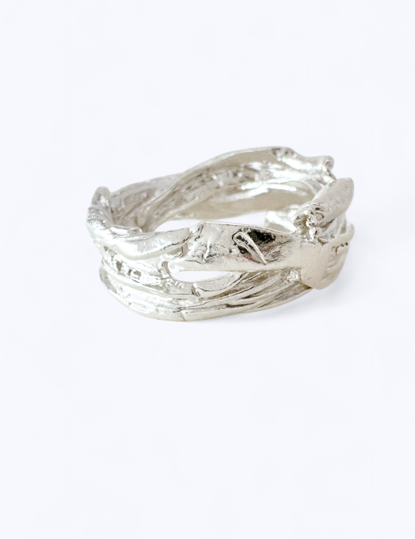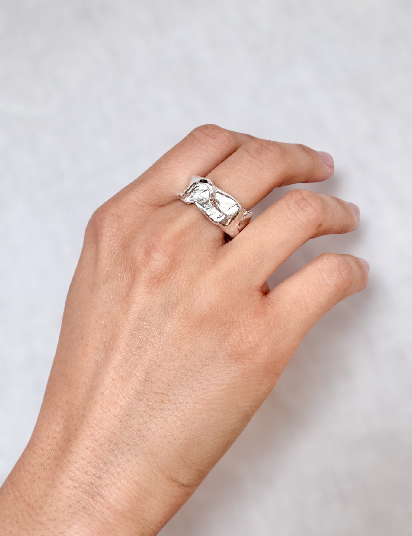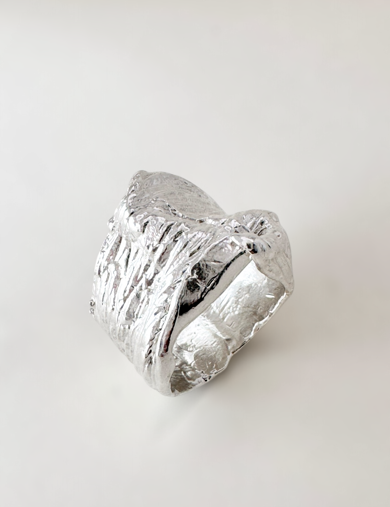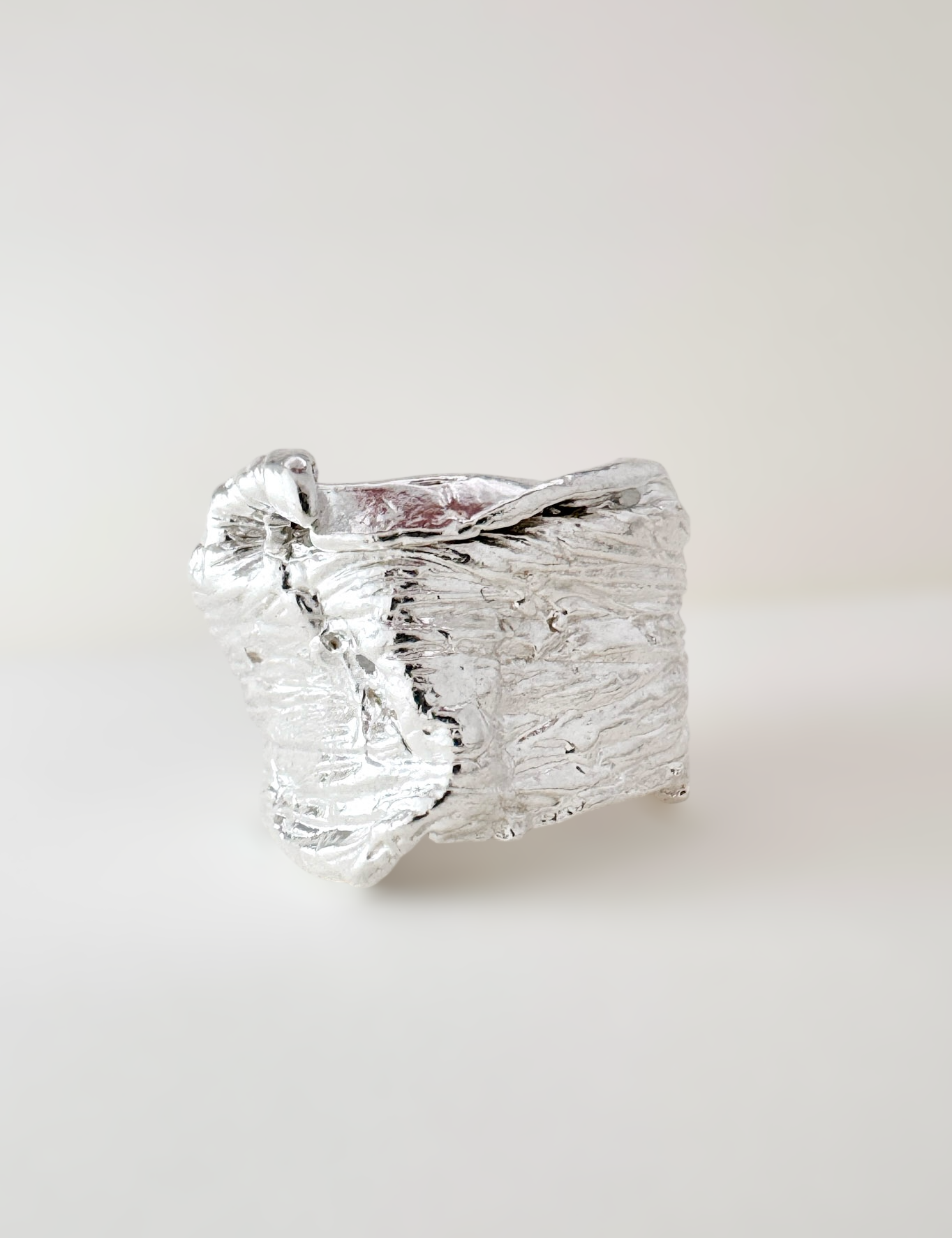 Plegados is a series of sculptural rings made in silver, inspired by the natural processes that shape the landscape: layers that fold, materials that give way, grooves that appear with the passage of time.