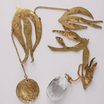 Each piece is handcrafted from hammered bronze sheets, with patina and painted details, accompanied by amber crystals that reflect the warmth of light.