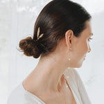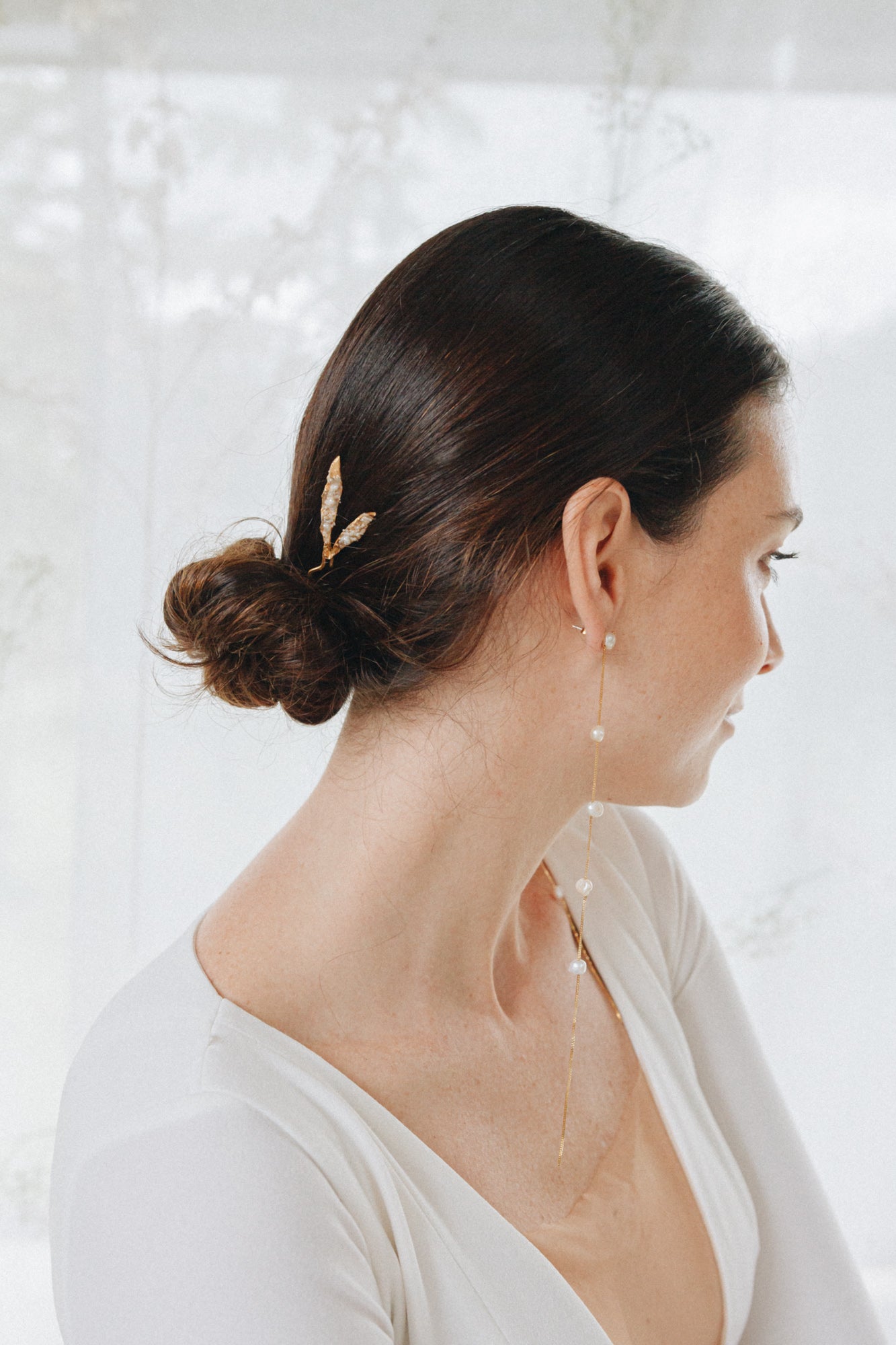 The pearl, a gem that slowly forms over time, adds a neutral, romantic, and delicate glow—perfect for enhancing both face and hairstyle on the wedding day.