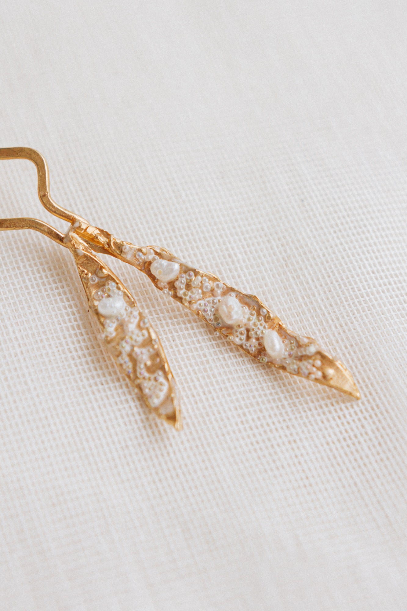 Long earrings, lightweight headpieces, and artisanal finishes define this high-jewelry proposal, created for brides who value noble materials, organic aesthetics, and meaningful design.
