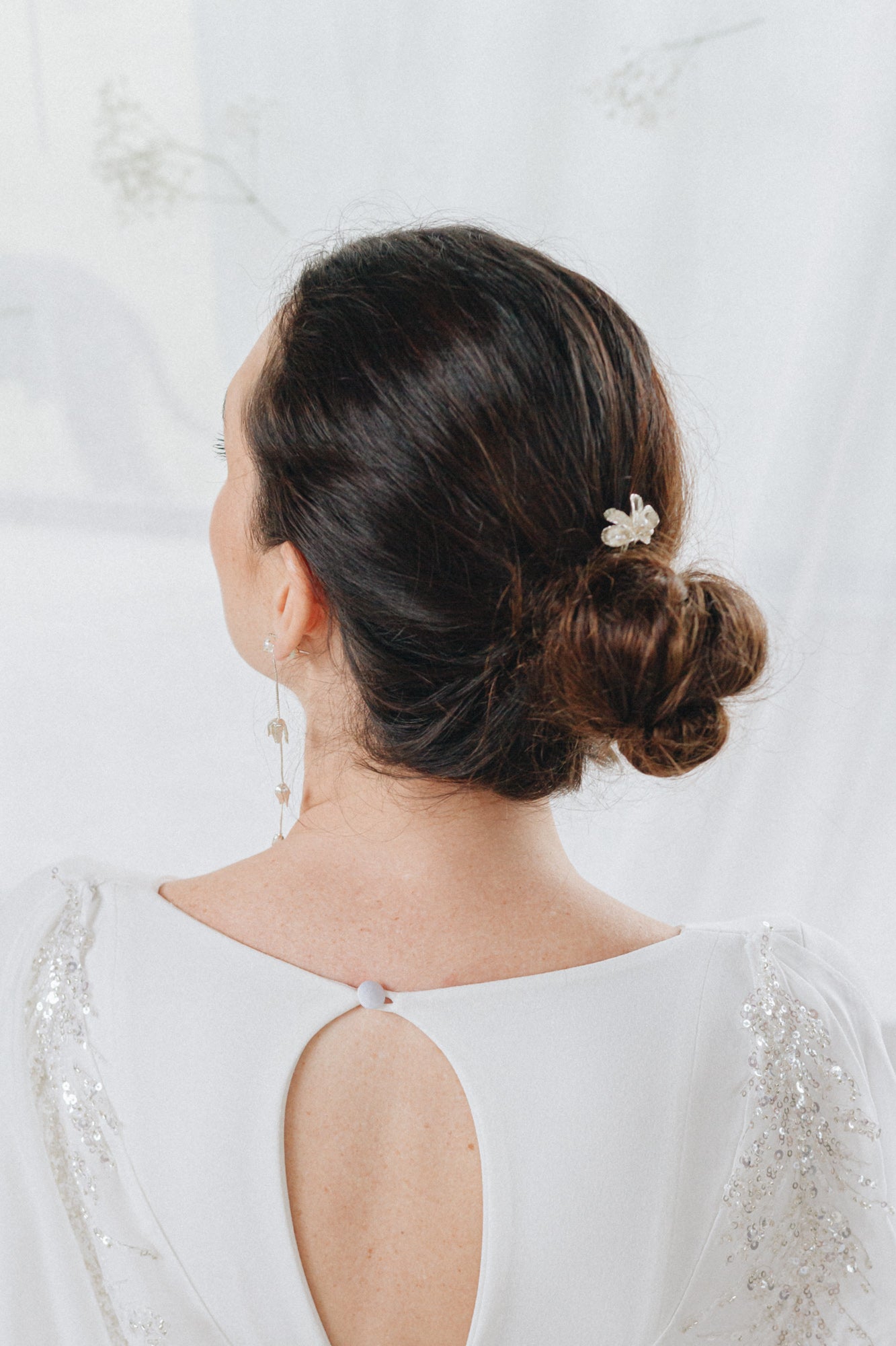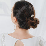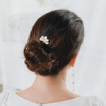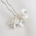 “Close-up side view of a woman’s ear wearing a single Banana Leaf Earring painted in sage-green with glass granulation on a gold-plated bronze setting, hair tucked behind ear against a neutral background.