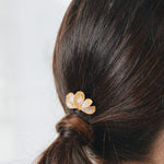 Close-up side view of a woman’s ear wearing the Mustard variant of the Lettuce Leaf Earring, hand-painted mustard-yellow with glass granulation on a gold-plated bronze setting, hair tucked behind ear against a neutral background.