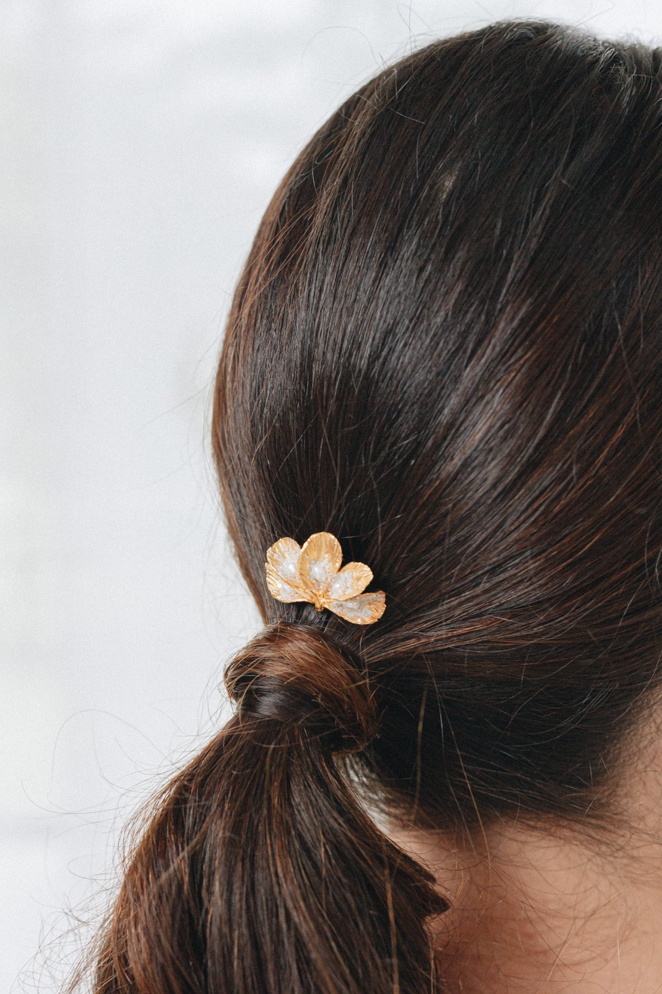 Flat lay of two Mustard variant Lettuce Leaf Earrings in gold-plated bronze, hand-painted in rust with glass granulation, placed on a white background.