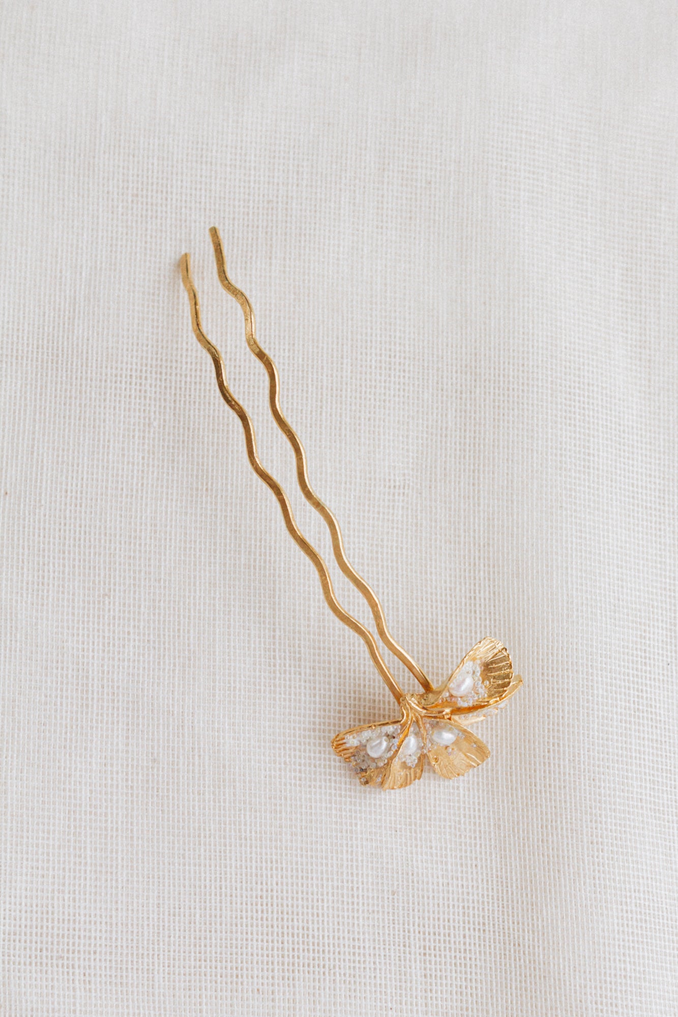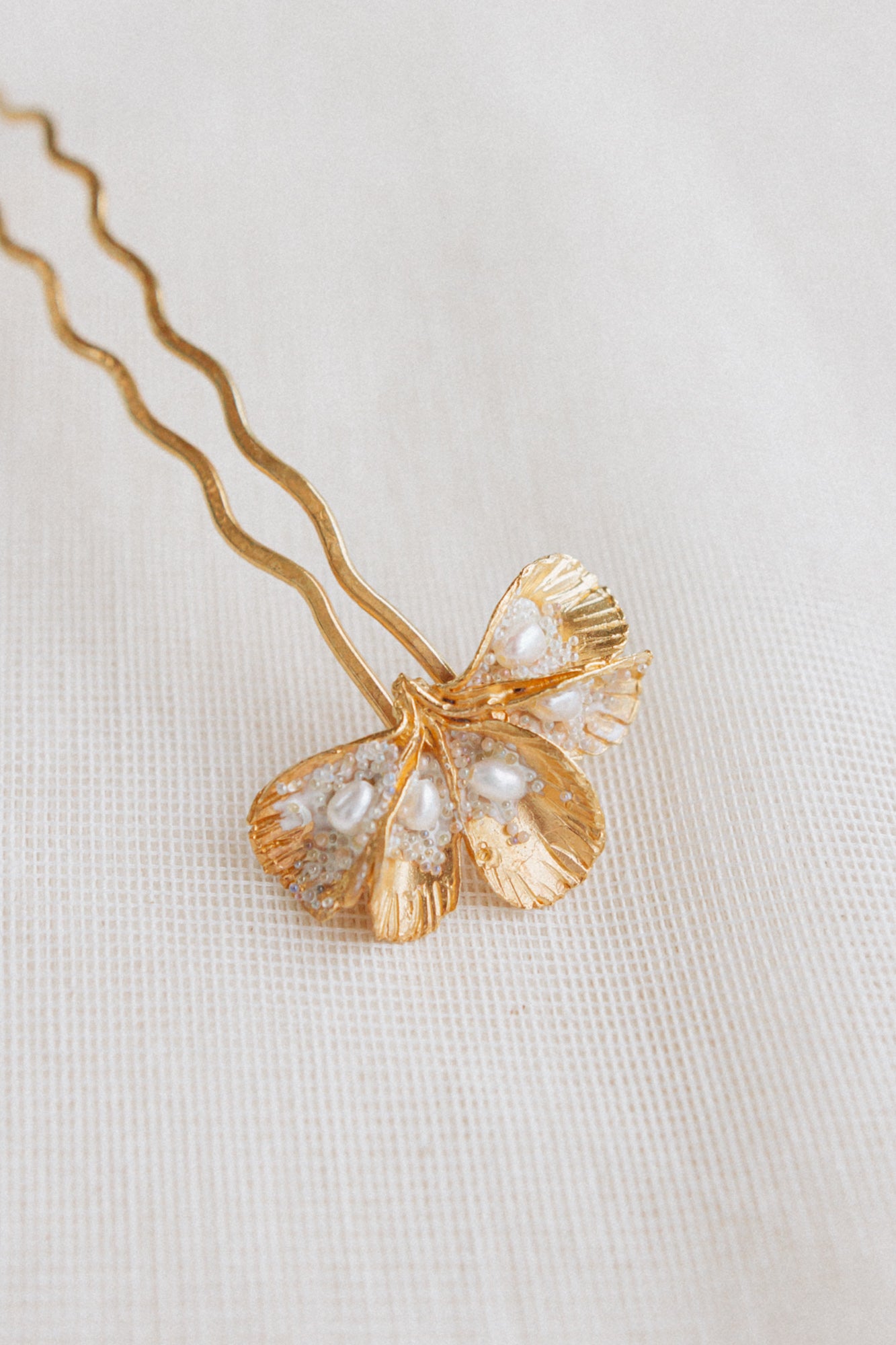 A. Gold plated bronze, hand painted with glass granulation and pearls.