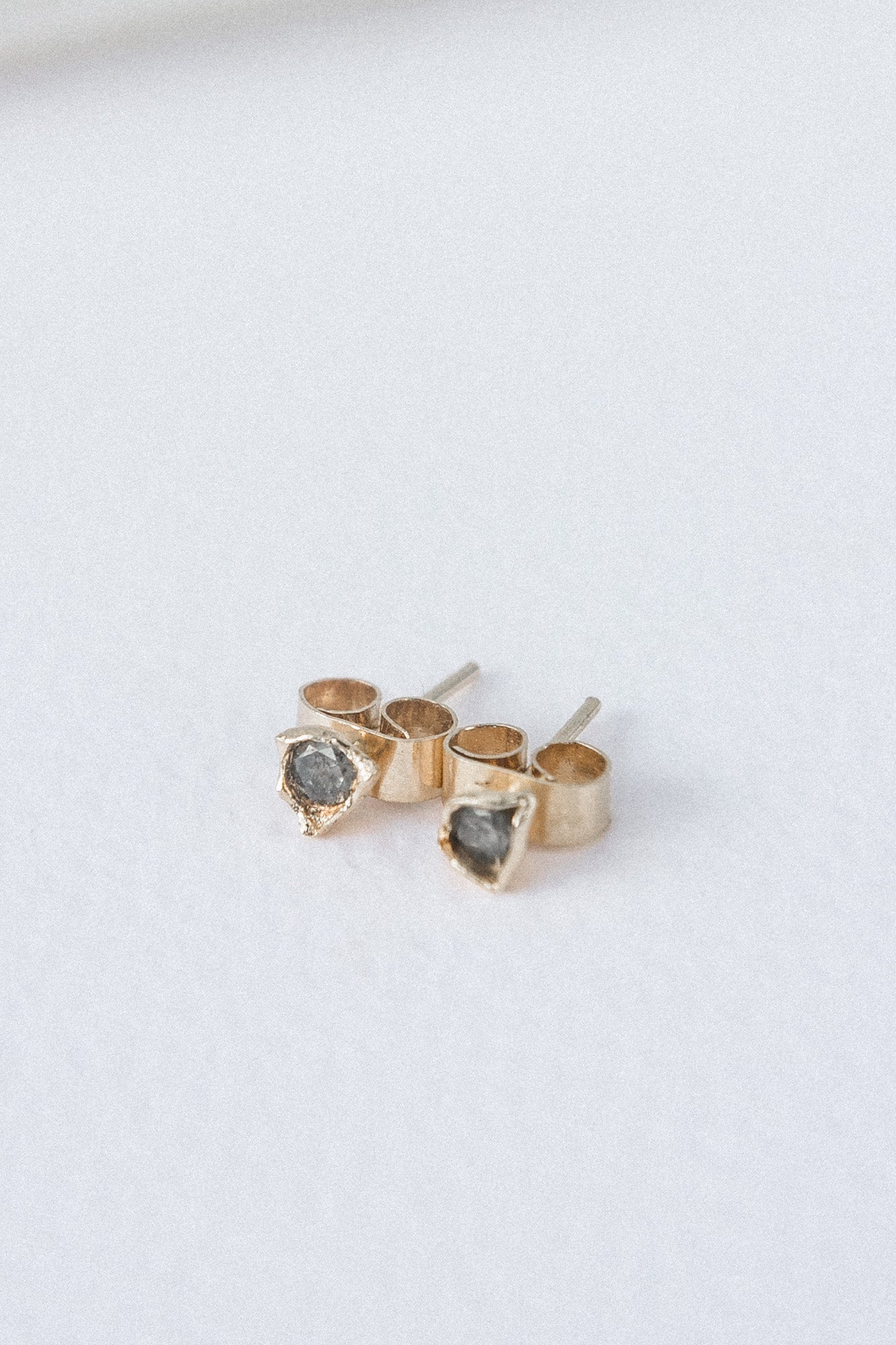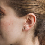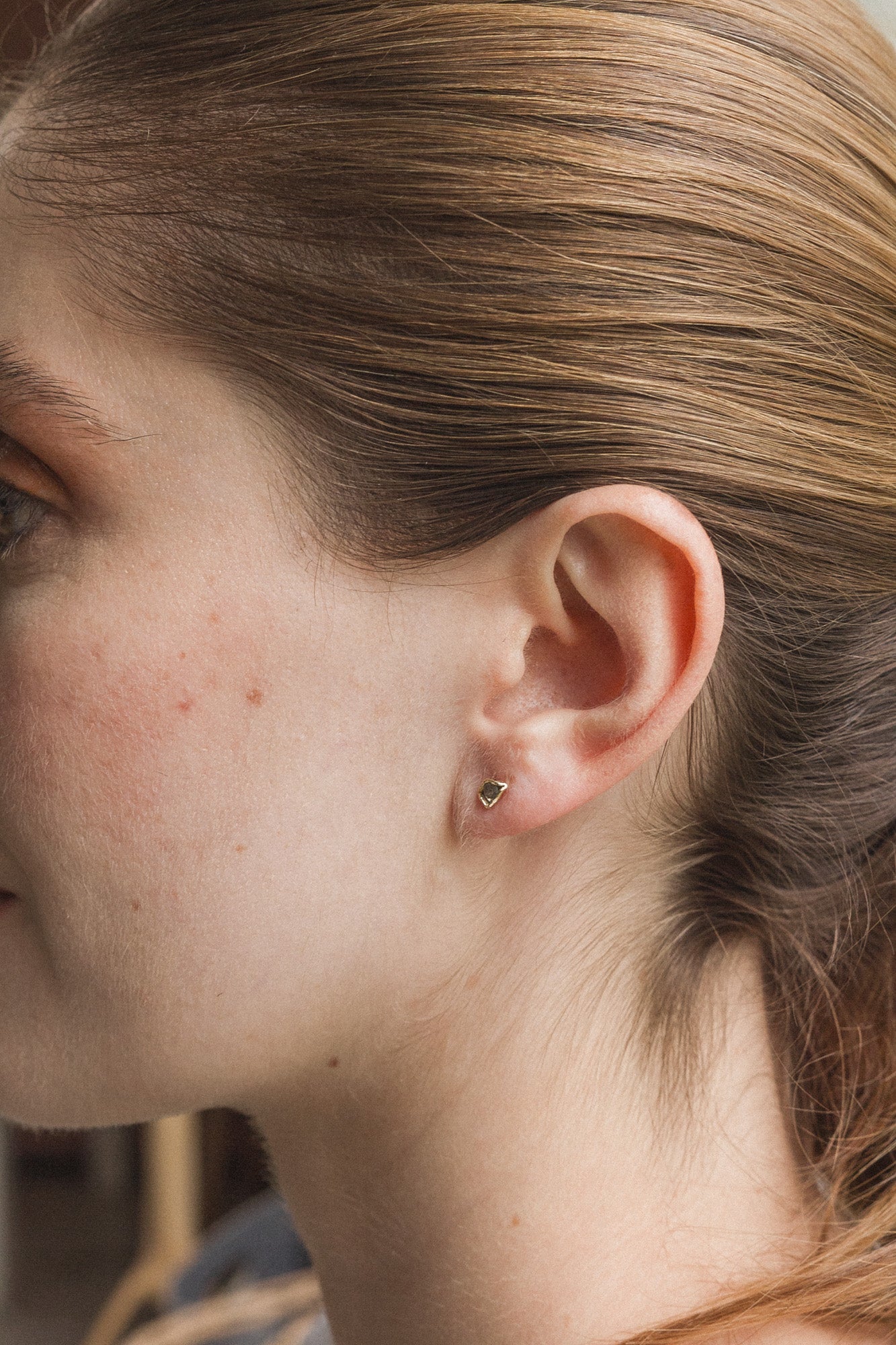 Portrait of a young woman with long hair wearing a single gold star stud earring, against a soft neutral background.
