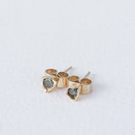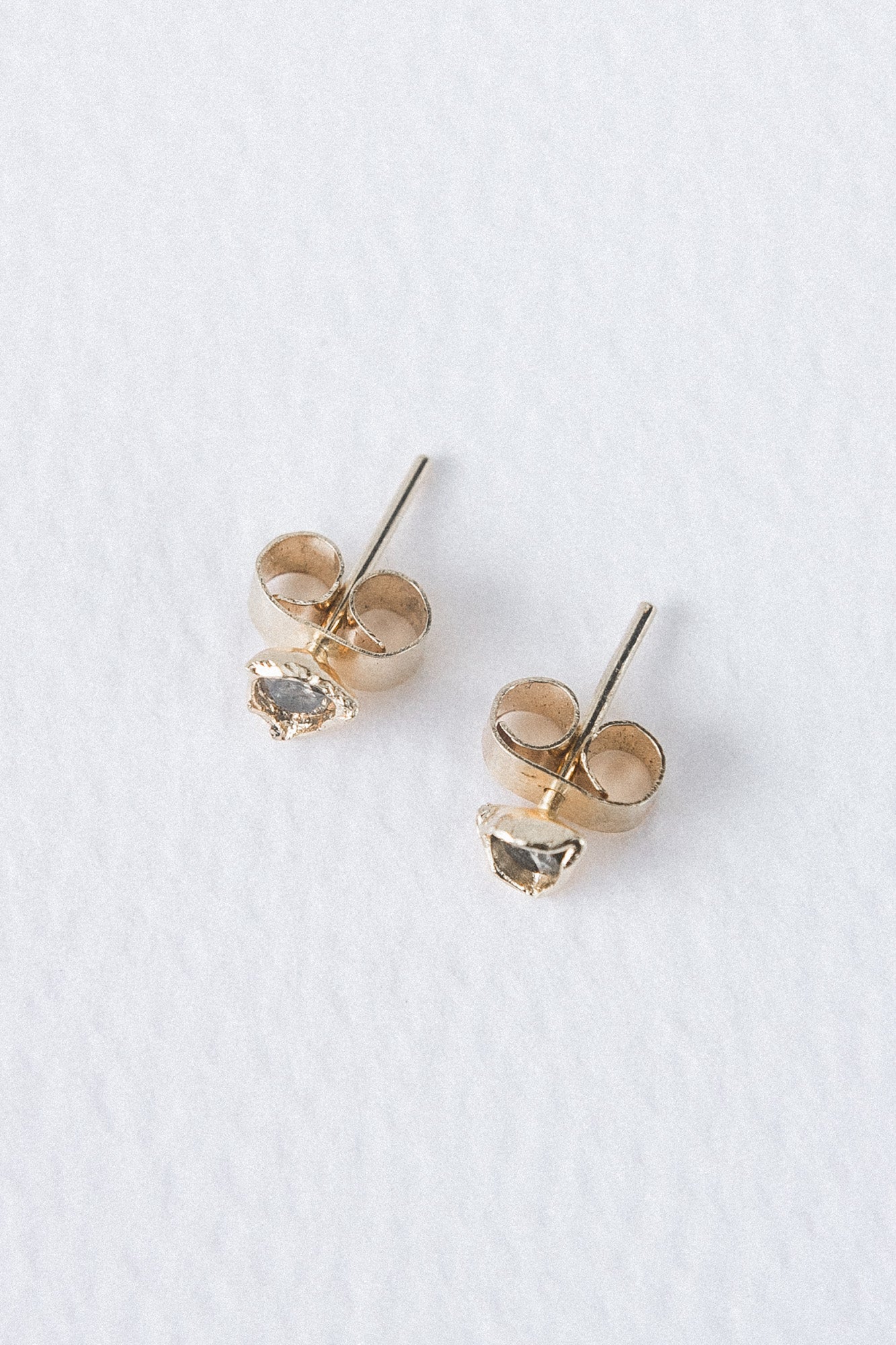 Two gold star stud earrings with white crystal detailing laid flat on a white surface, with delicate leaf-shaped shadows overhead.