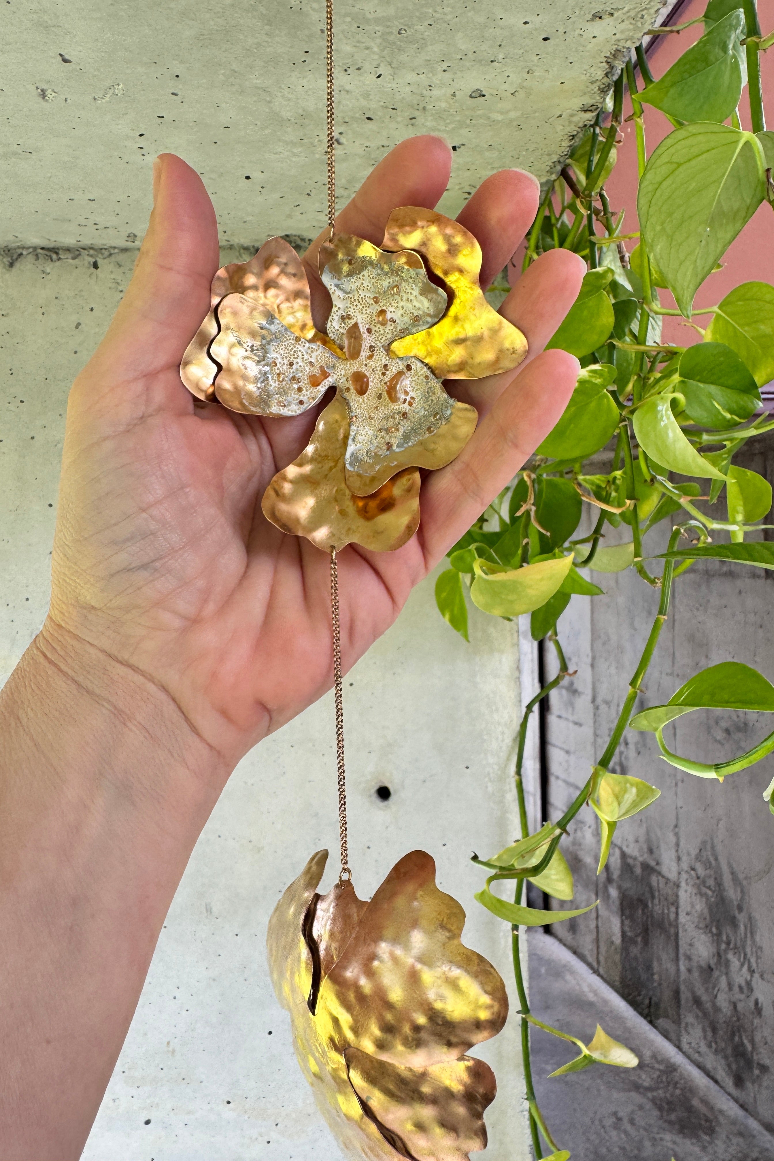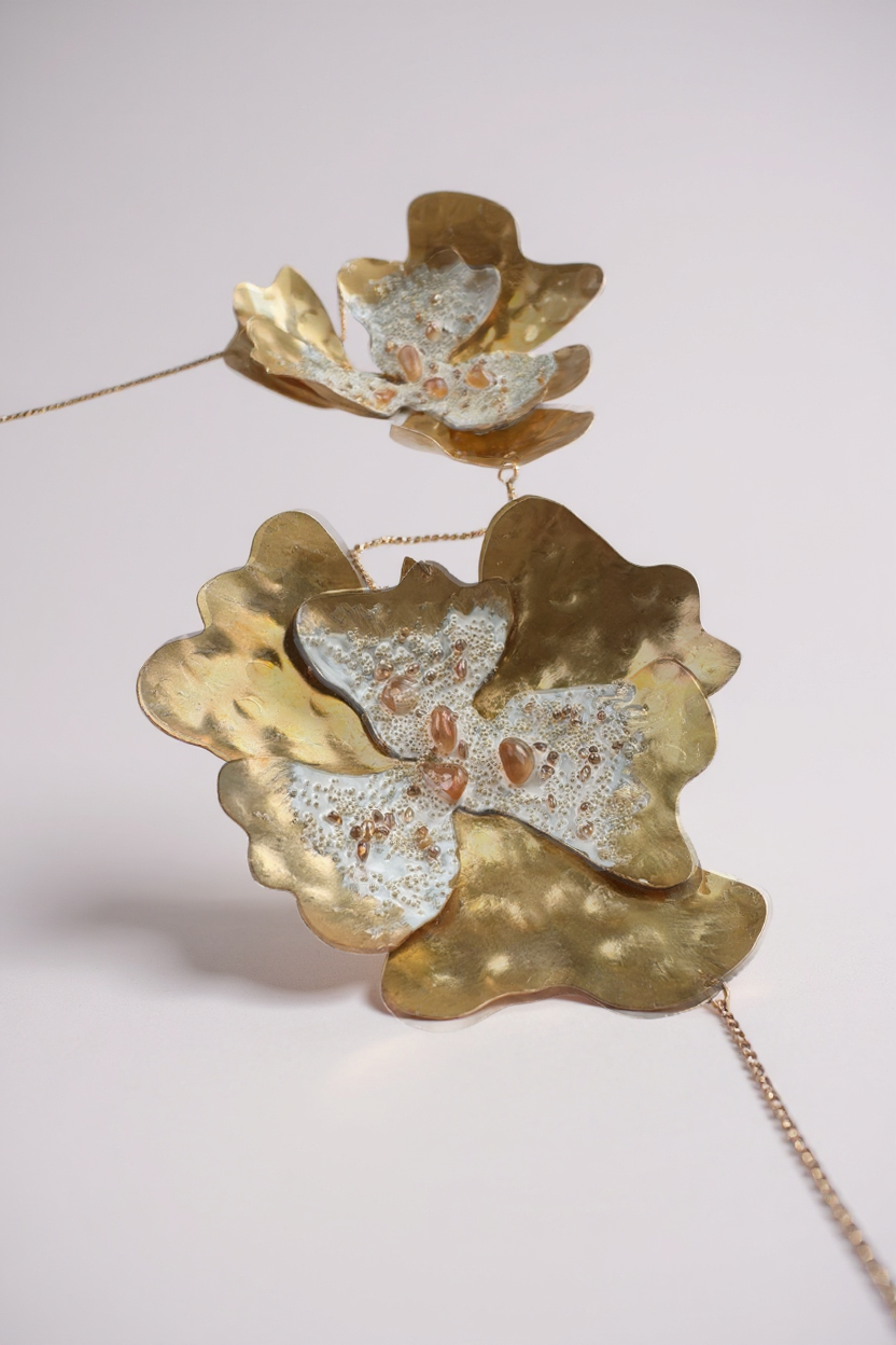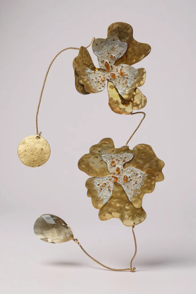 Each piece is handcrafted from hammered bronze sheets, with patina and painted details, accompanied by amber crystals that reflect the warmth of light.