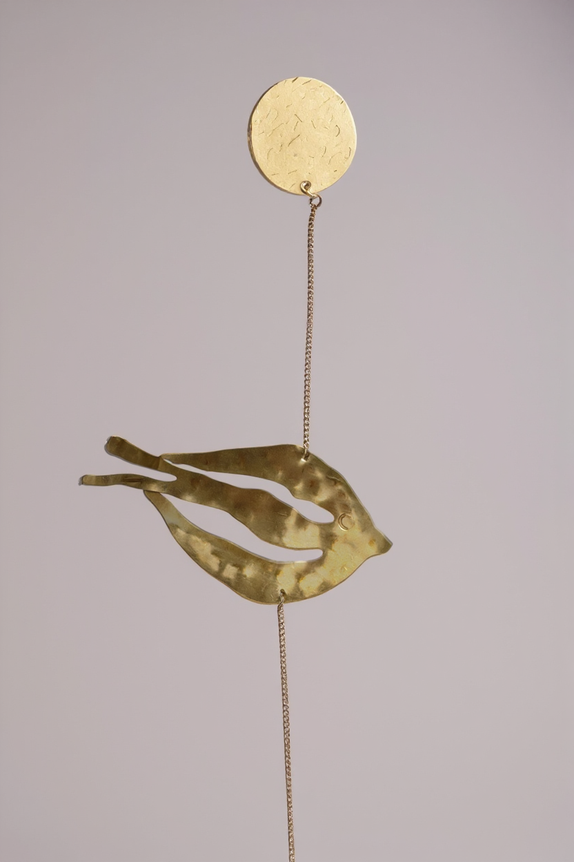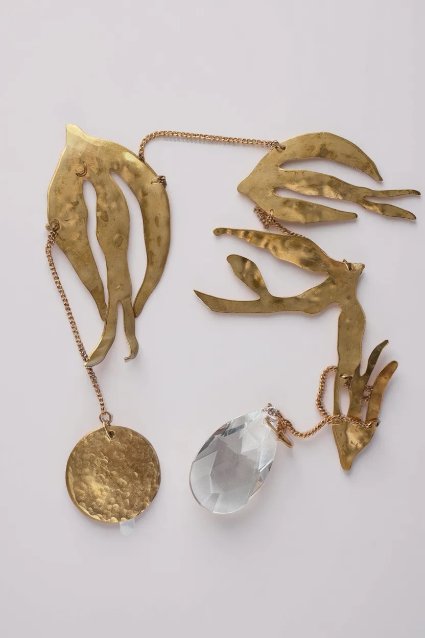 Each piece is handcrafted from hammered bronze sheets, with patina and painted details, accompanied by amber crystals that reflect the warmth of light.