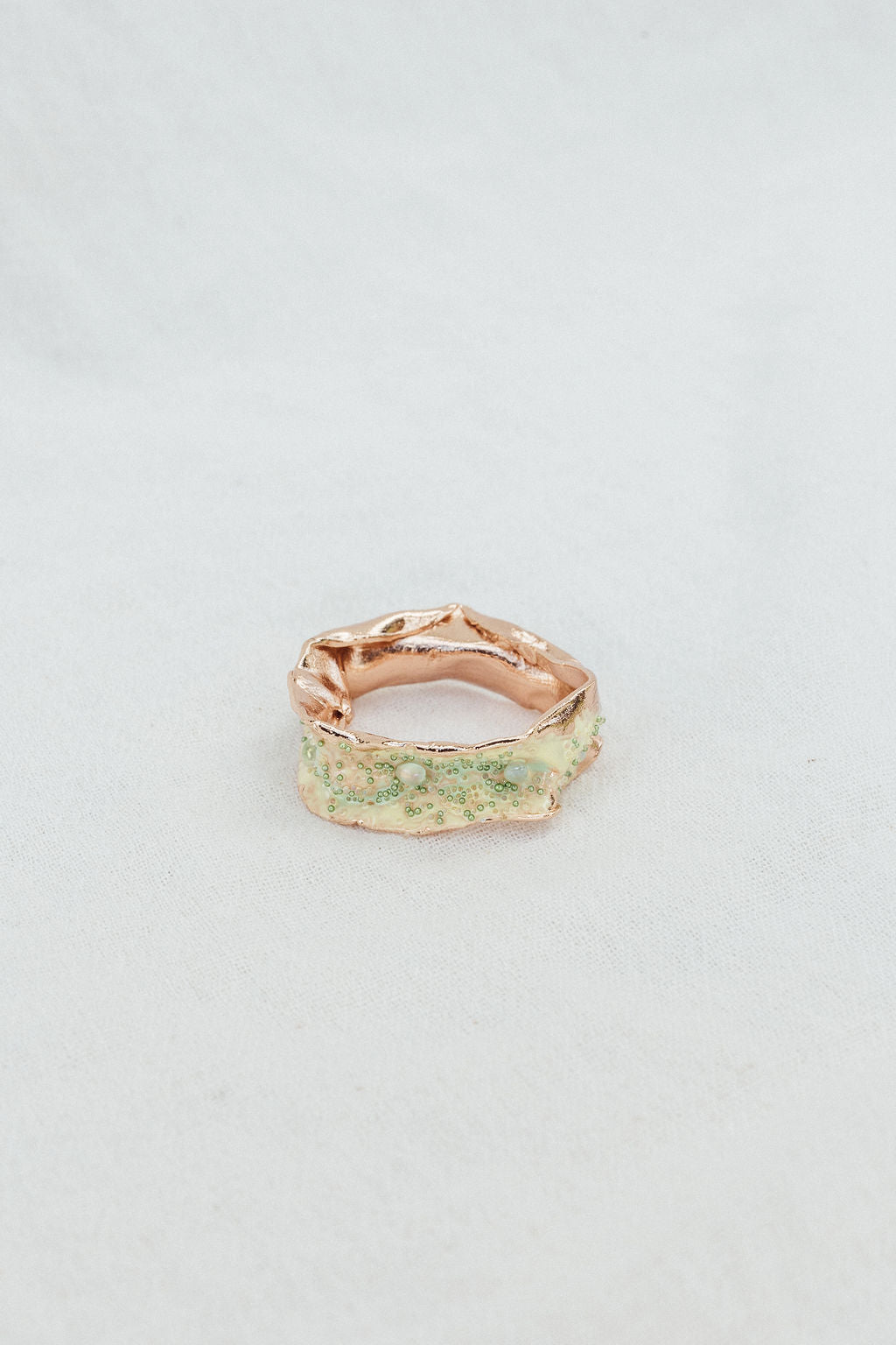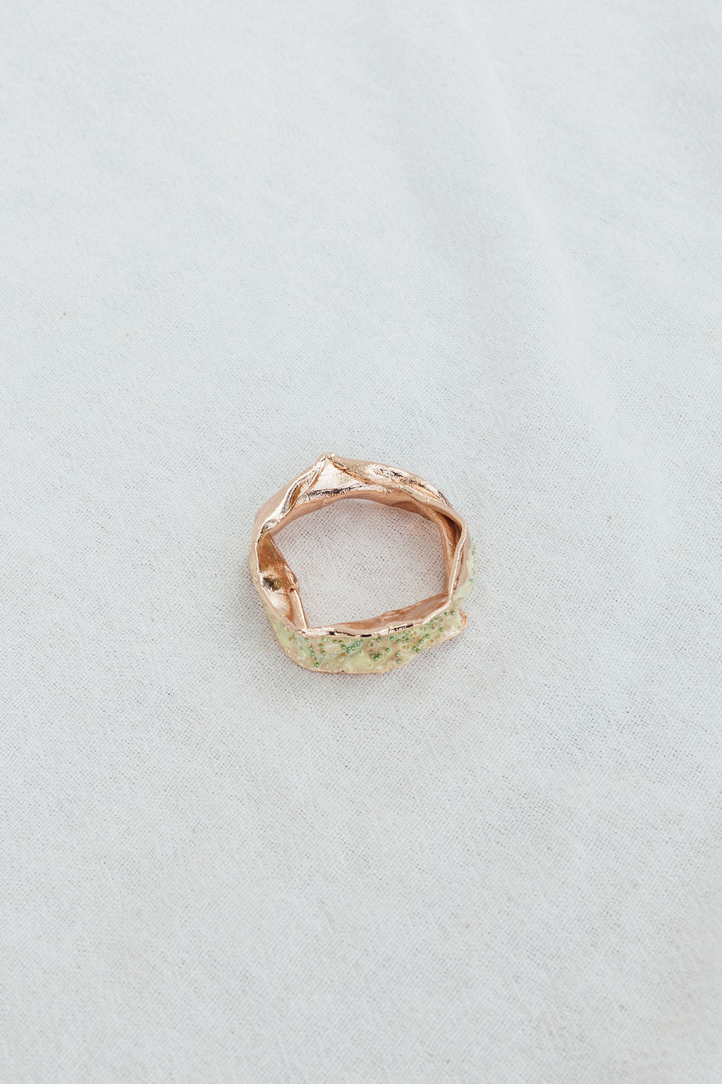Close-up side view of a woman’s ear wearing the Mustard variant of the Lettuce Leaf Earring, hand-painted mustard-yellow with glass granulation on a gold-plated bronze setting, hair tucked behind ear against a neutral background.