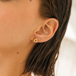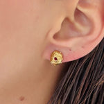 Close-up side view of a woman’s ear wearing the Mustard variant of the Lettuce Leaf Earring, hand-painted mustard-yellow with glass granulation on a gold-plated bronze setting, hair tucked behind ear against a neutral background.