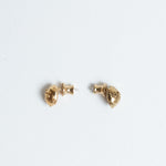 Flat lay of two Mustard variant Lettuce Leaf Earrings in gold-plated bronze, hand-painted in rust with glass granulation, placed on a white background.