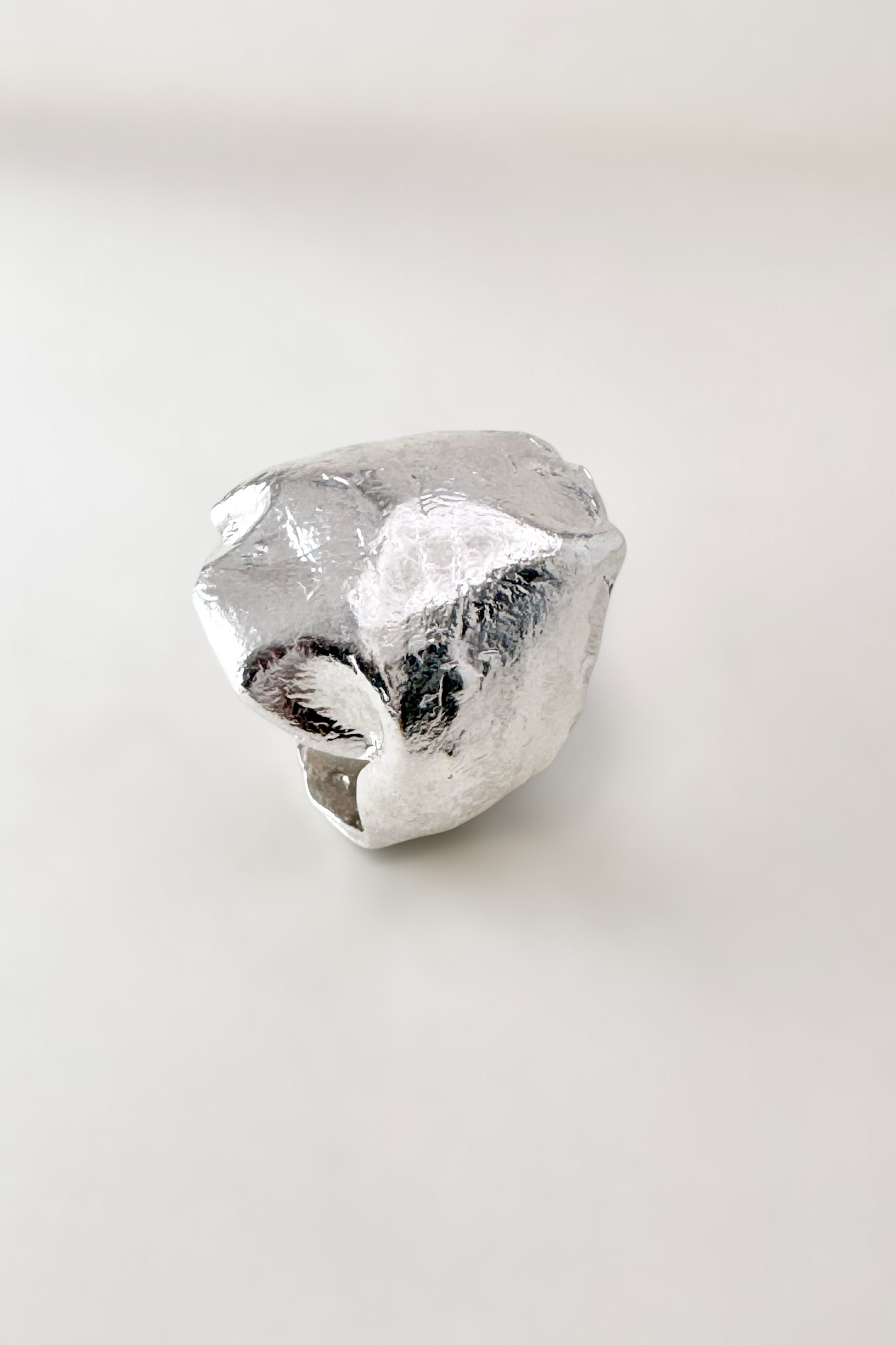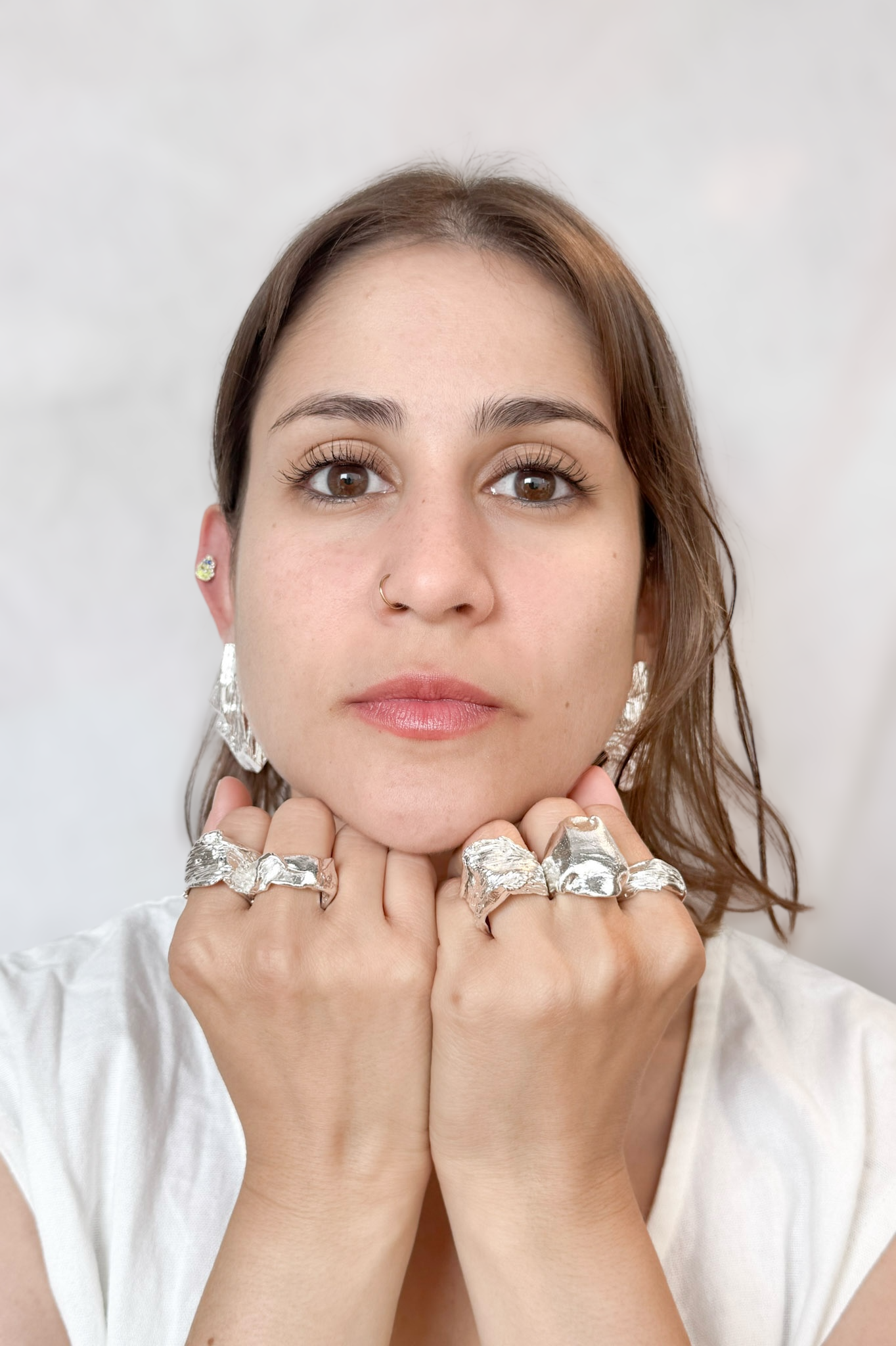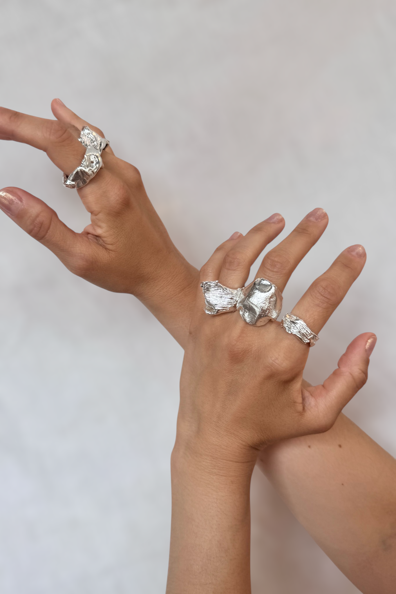 Plegados is a series of sculptural rings made in silver, inspired by the natural processes that shape the landscape: layers that fold, materials that give way, grooves that appear with the passage of time.