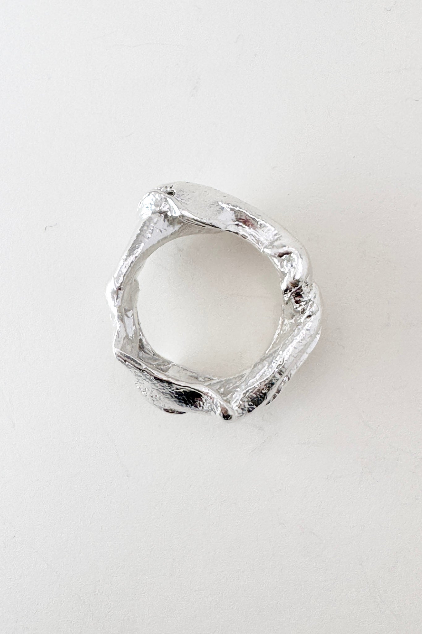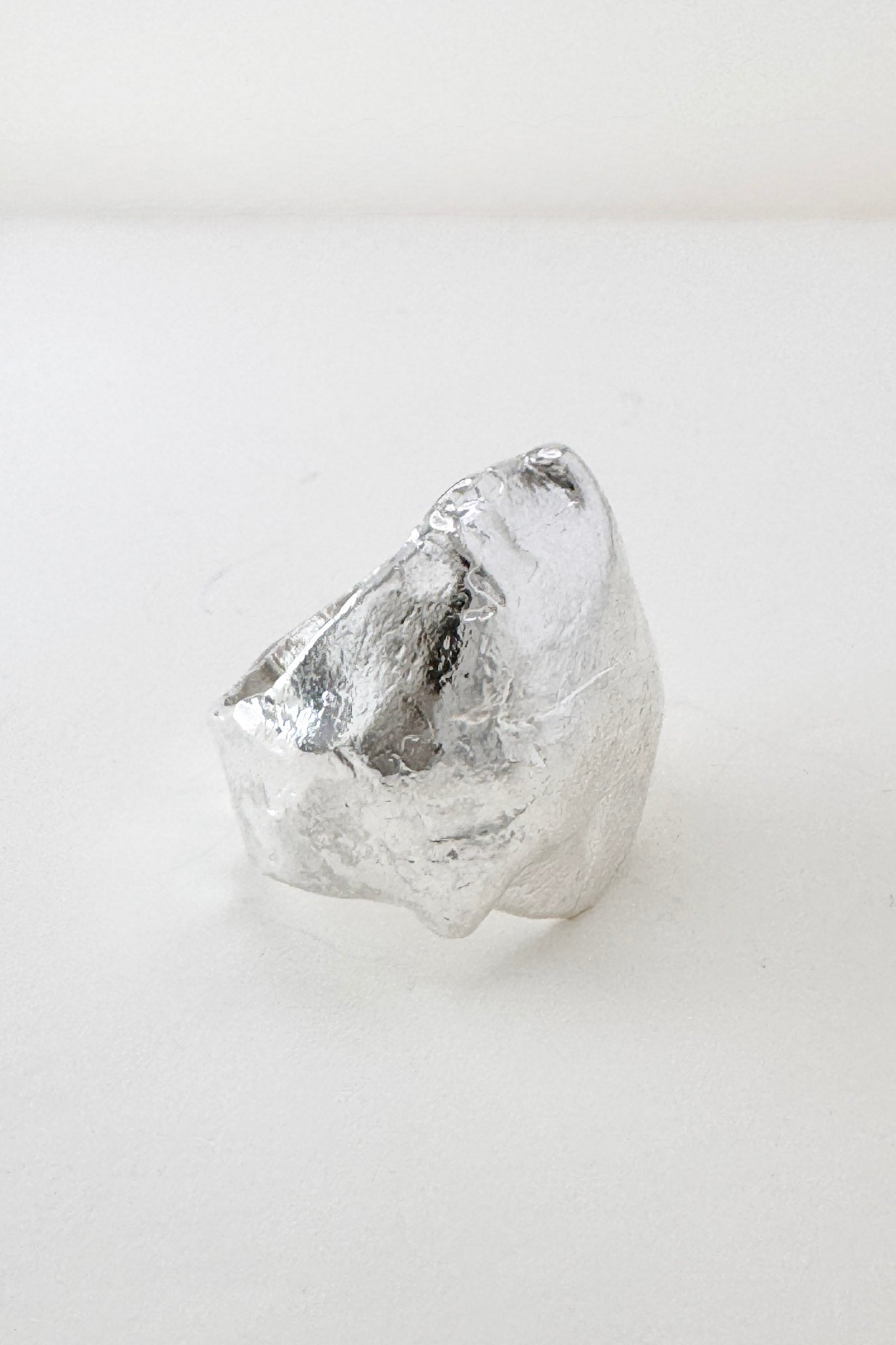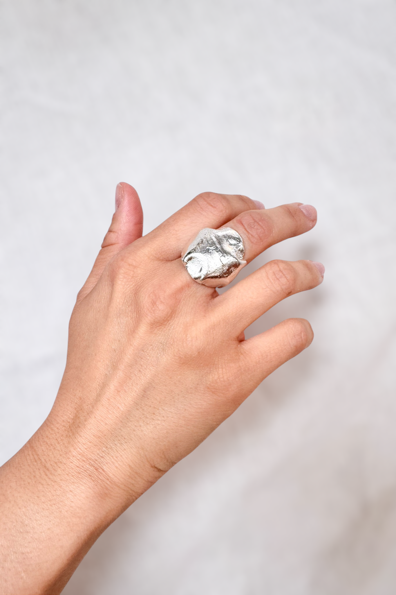 Plegados is a series of sculptural rings made in silver, inspired by the natural processes that shape the landscape: layers that fold, materials that give way, grooves that appear with the passage of time.