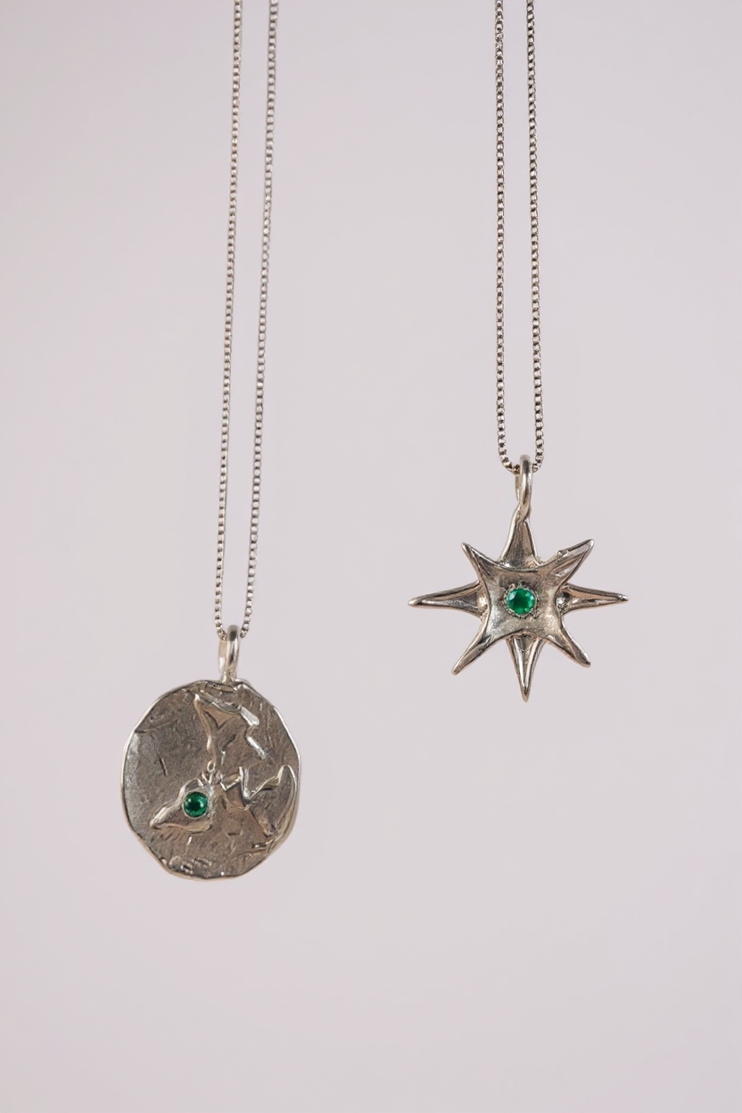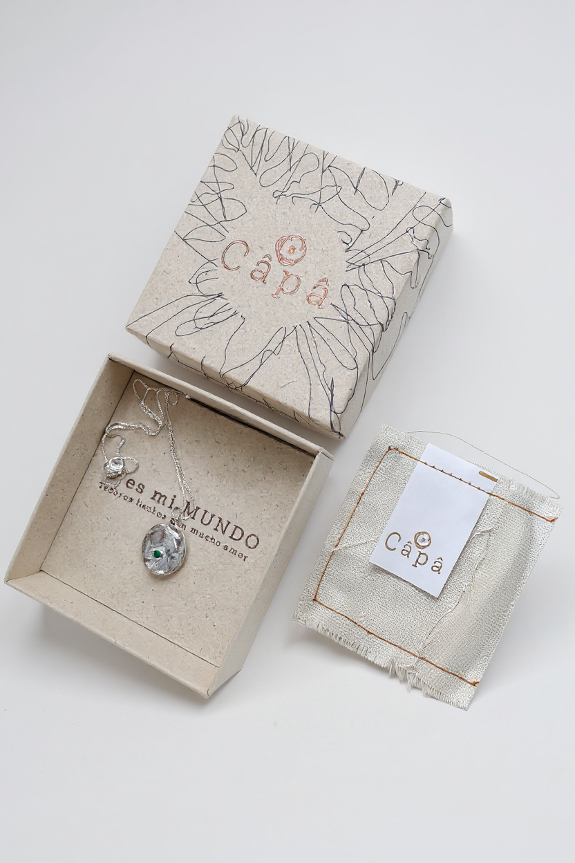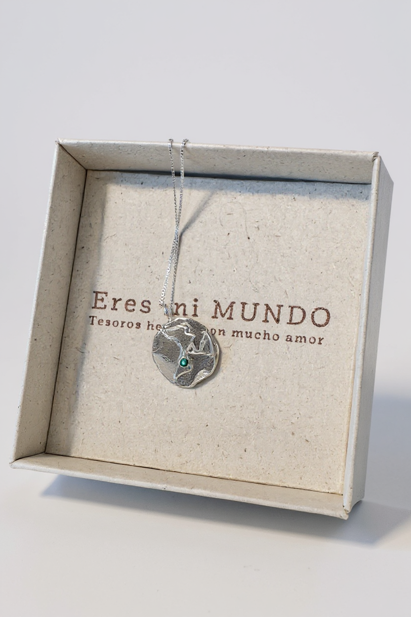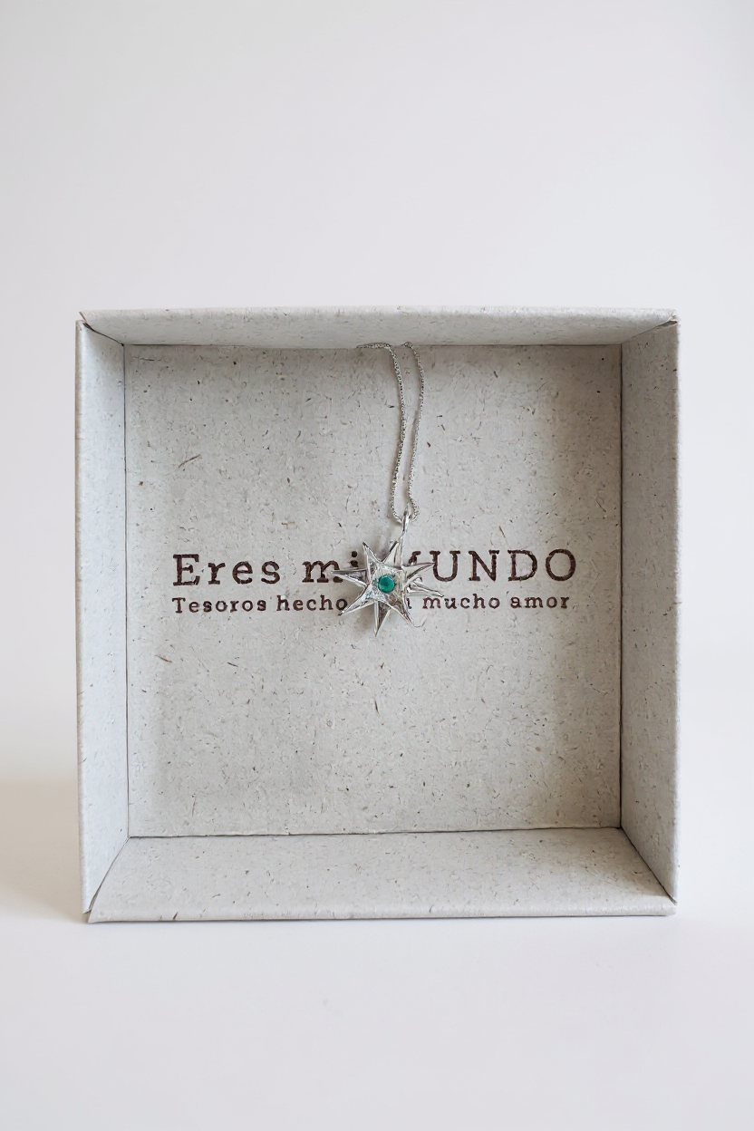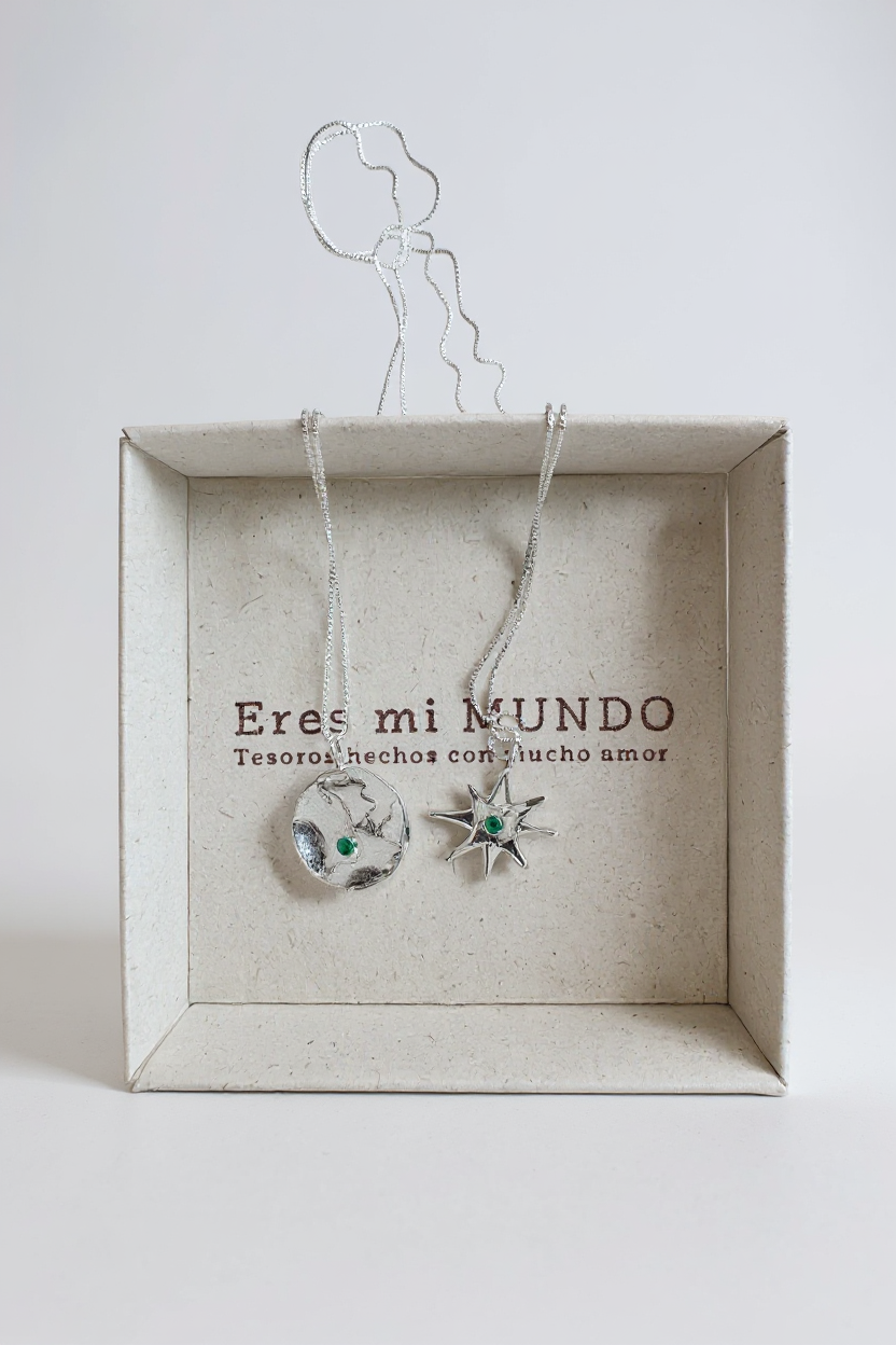 It is a capsule of two silver necklaces that celebrates unions: a world and a star in 925 sterling silver, linked by a green zircon that evokes the exuberance of Colombia.
