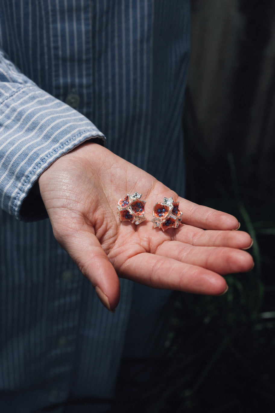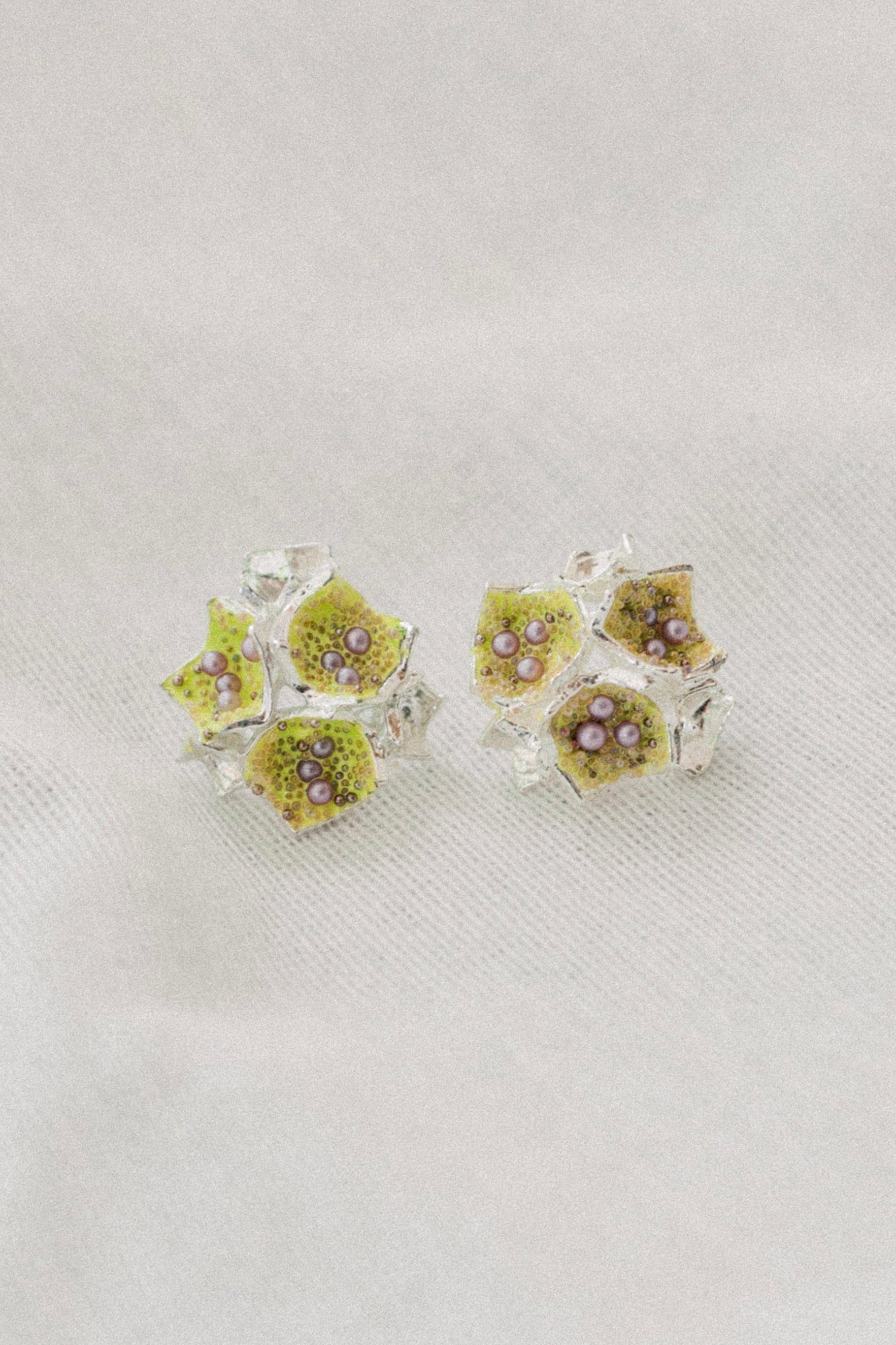 “Pair of Lettuce Leaf Earrings in gold-plated brass hand-painted  rust—with glass granulation detail, displayed on a white background.