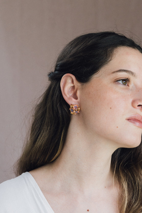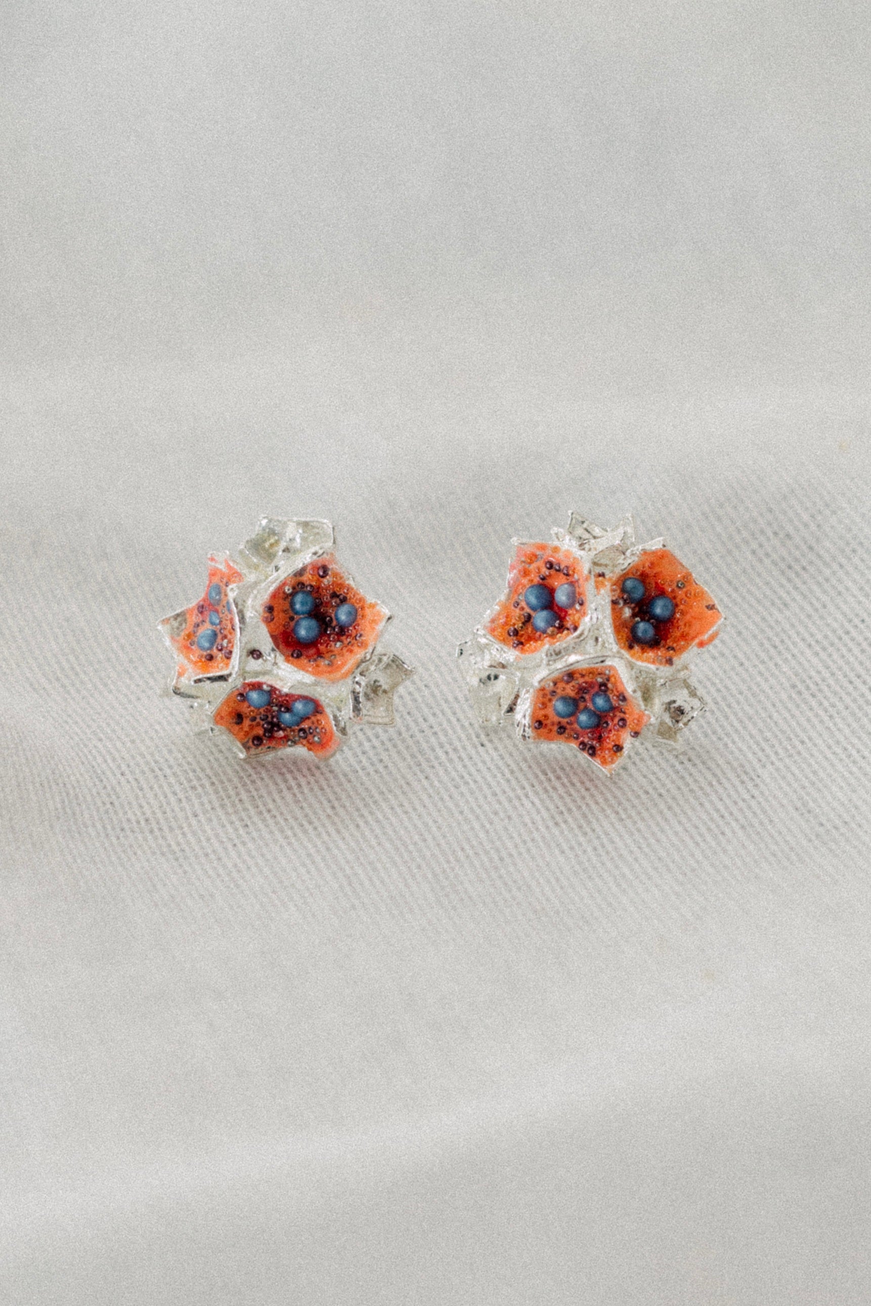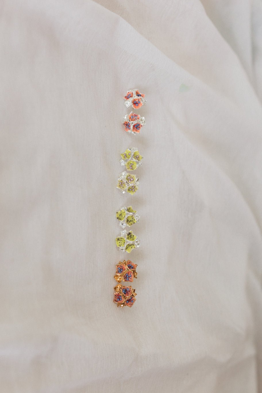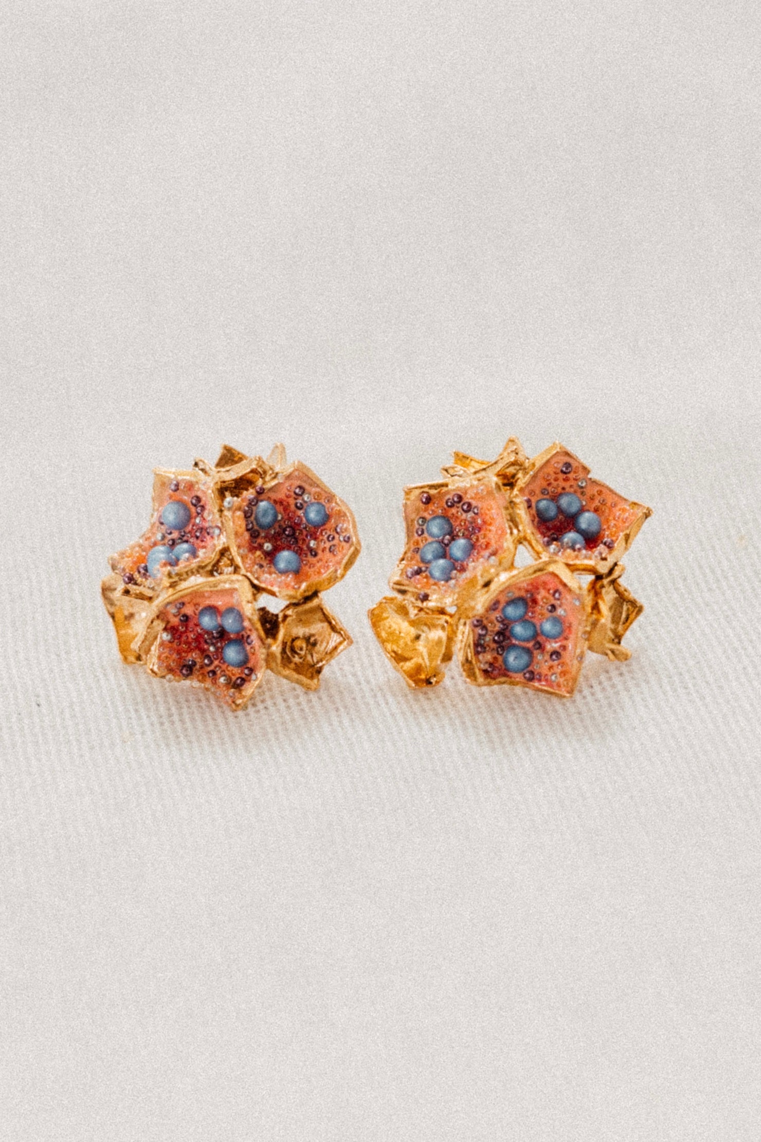 Flat lay of two Mustard variant Lettuce Leaf Earrings in gold-plated bronze, hand-painted in rust with glass granulation, placed on a white background.