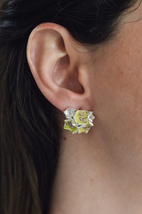 Close-up side view of a woman’s ear wearing the Mustard variant of the Lettuce Leaf Earring, hand-painted mustard-yellow with glass granulation on a gold-plated bronze setting, hair tucked behind ear against a neutral background.