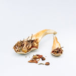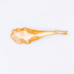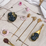 Flat lay of two Mustard variant Lettuce Leaf Earrings in gold-plated bronze, hand-painted in rust with glass granulation, placed on a white background.