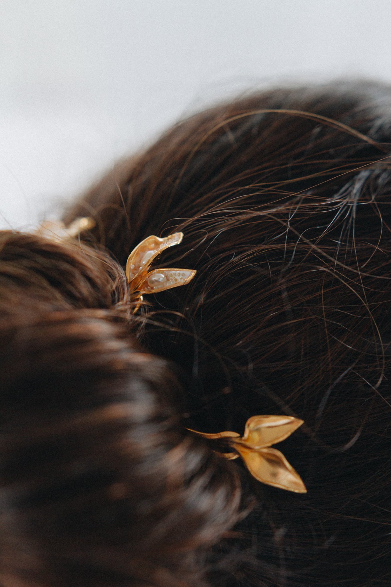 Close-up side view of a woman’s ear wearing the Mustard variant of the Lettuce Leaf Earring, hand-painted mustard-yellow with glass granulation on a gold-plated bronze setting, hair tucked behind ear against a neutral background.