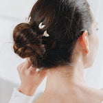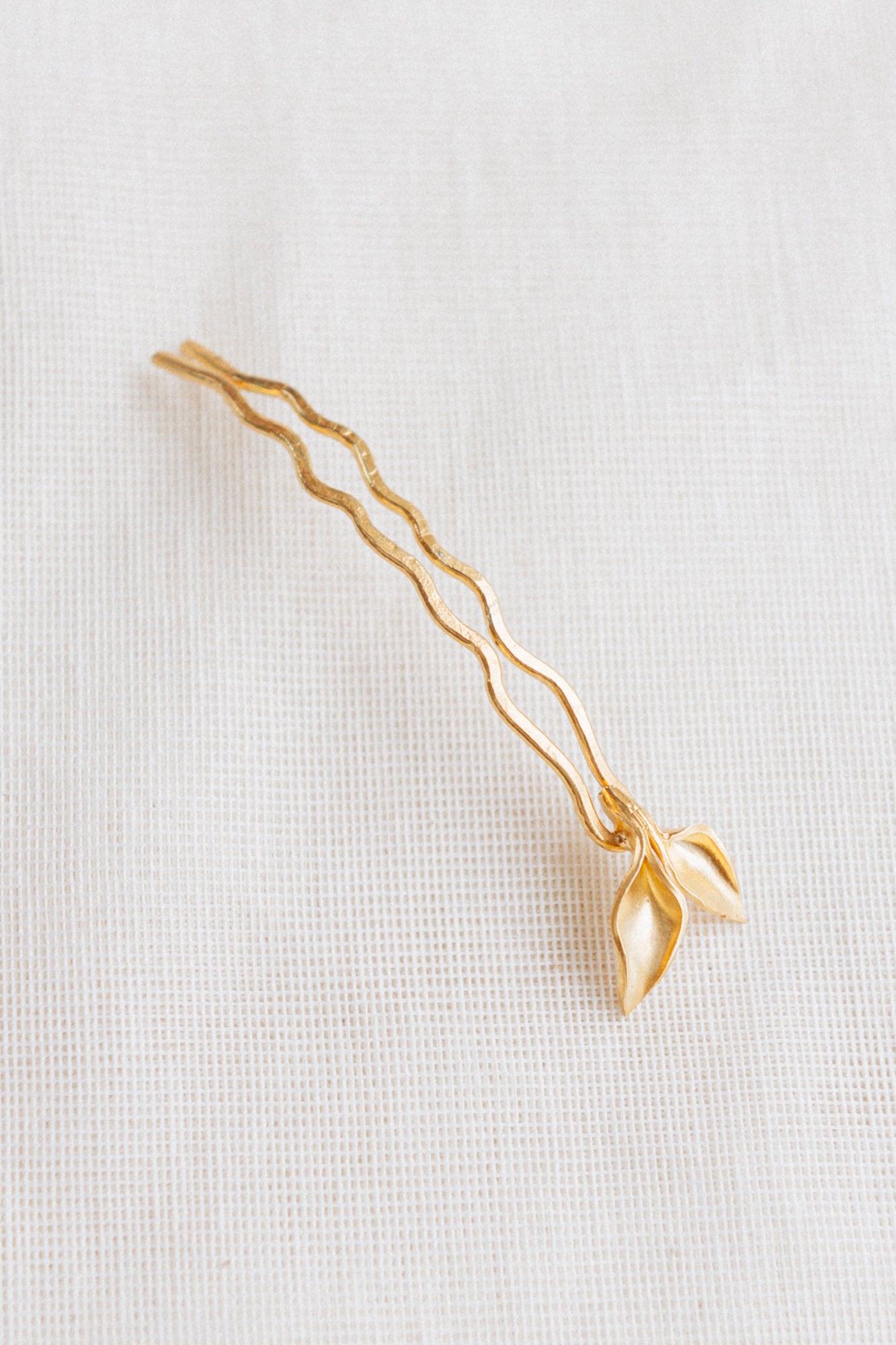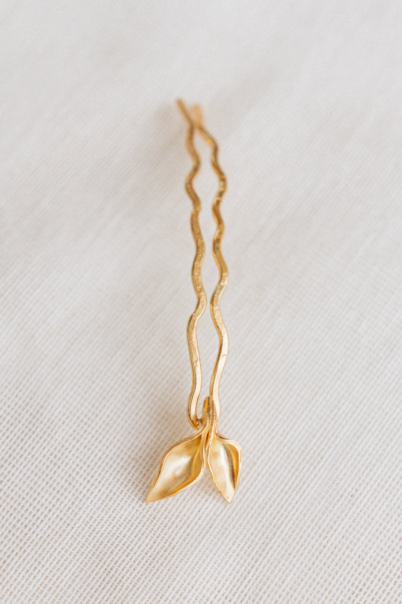 Flat lay of two Mustard variant Lettuce Leaf Earrings in gold-plated bronze, hand-painted in rust with glass granulation, placed on a white background.