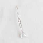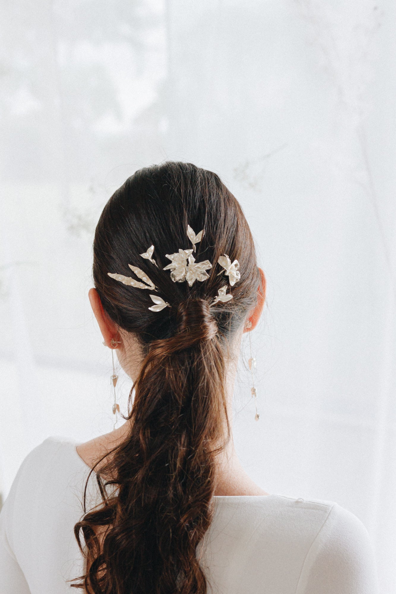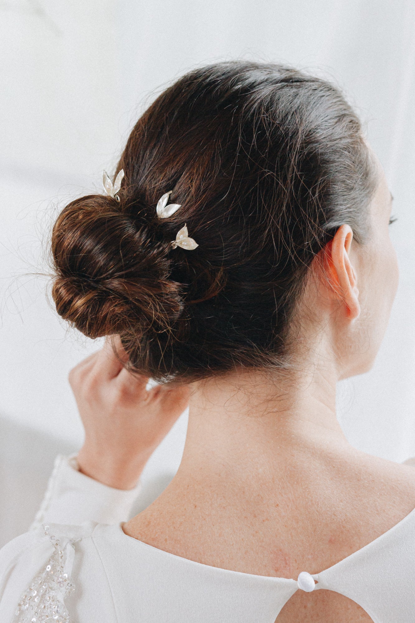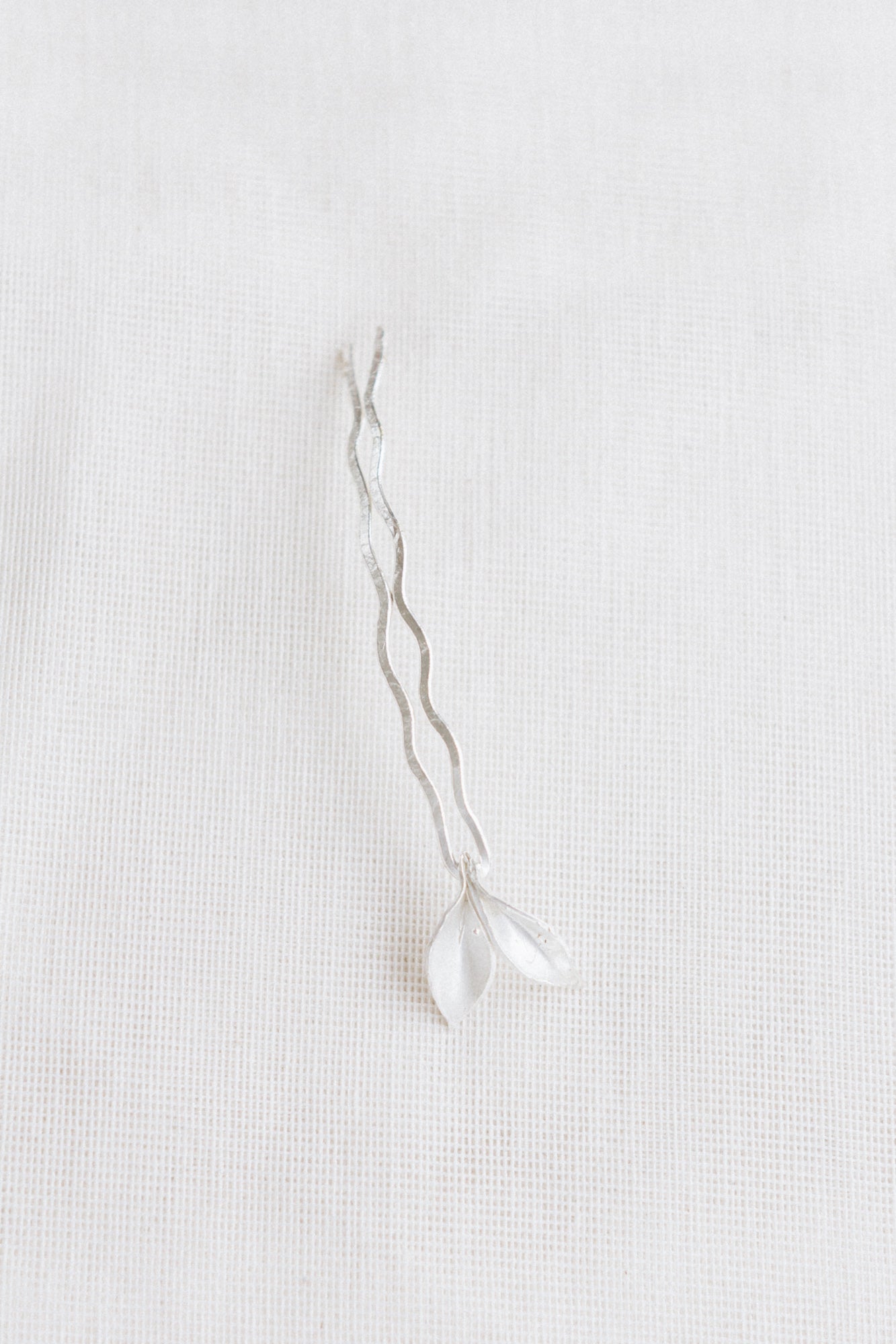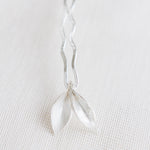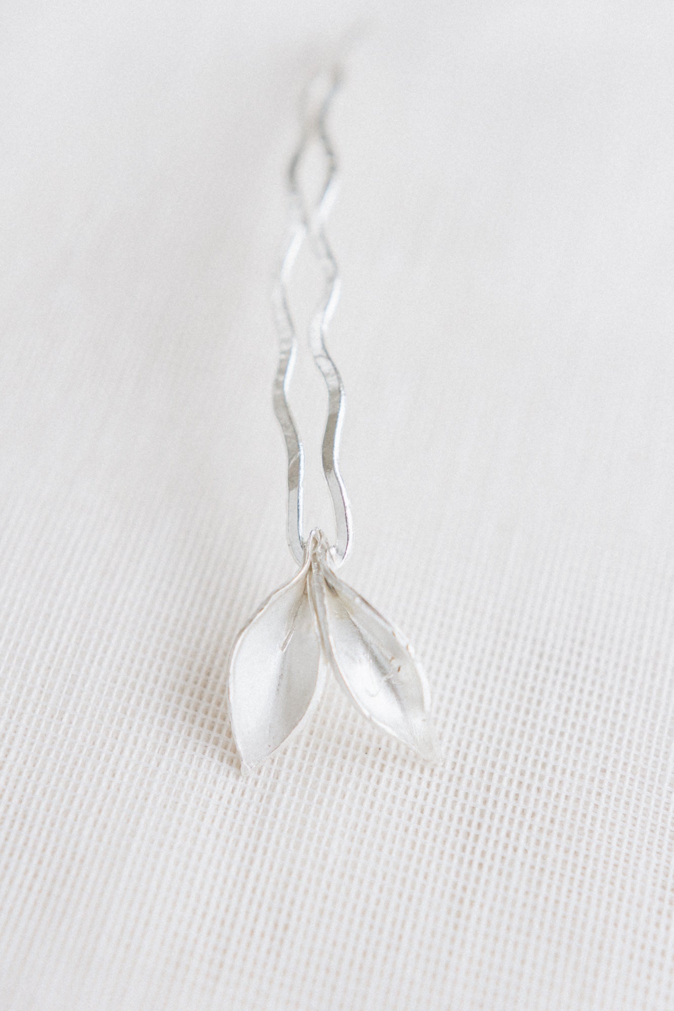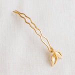 “Close-up side view of a woman’s ear wearing a single Banana Leaf Earring painted in sage-green with glass granulation on a gold-plated bronze setting, hair tucked behind ear against a neutral background.