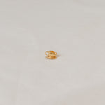 Close-up side view of a woman’s ear wearing the Mustard variant of the Lettuce Leaf Earring, hand-painted mustard-yellow with glass granulation on a gold-plated bronze setting, hair tucked behind ear against a neutral background.