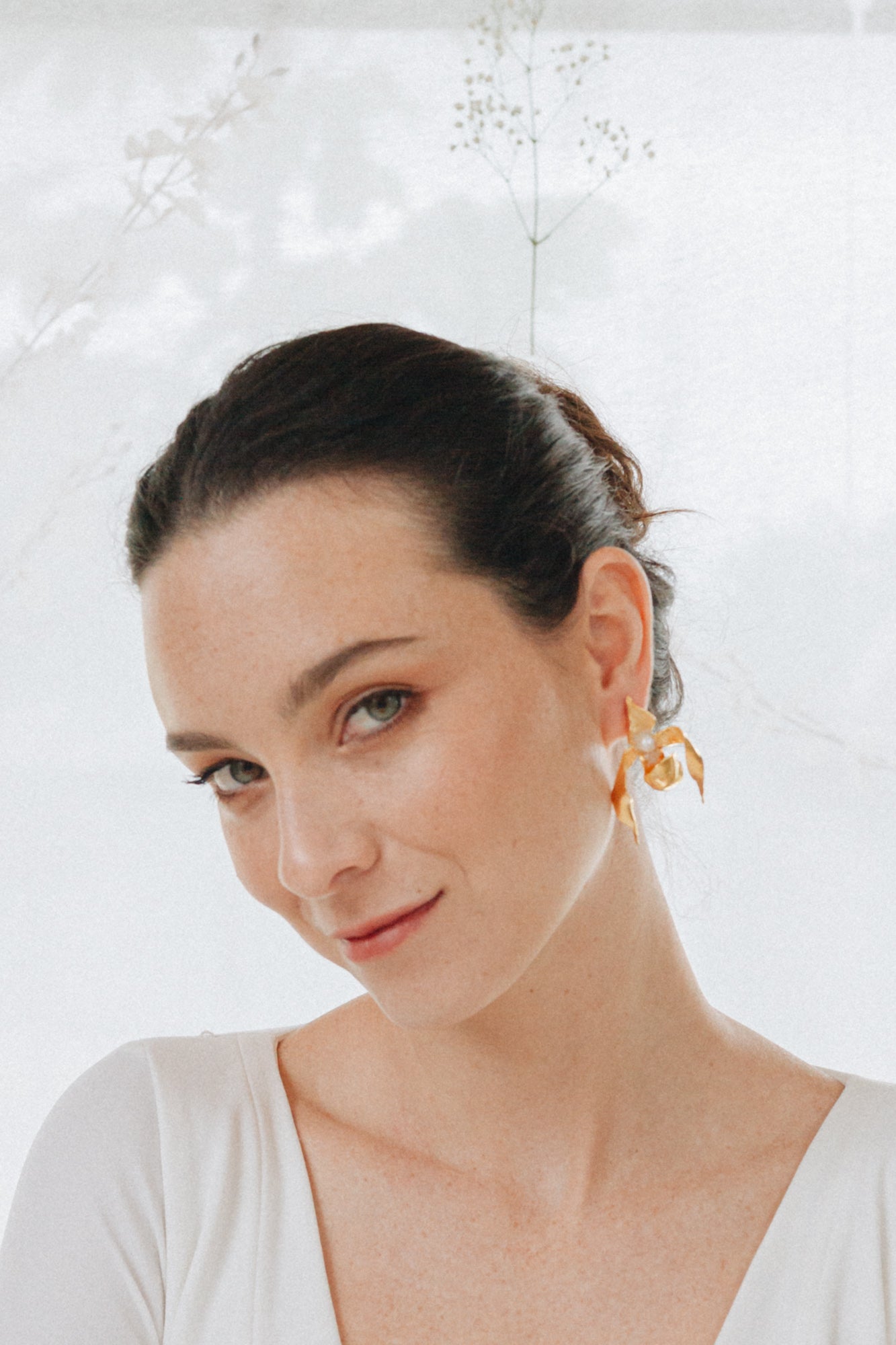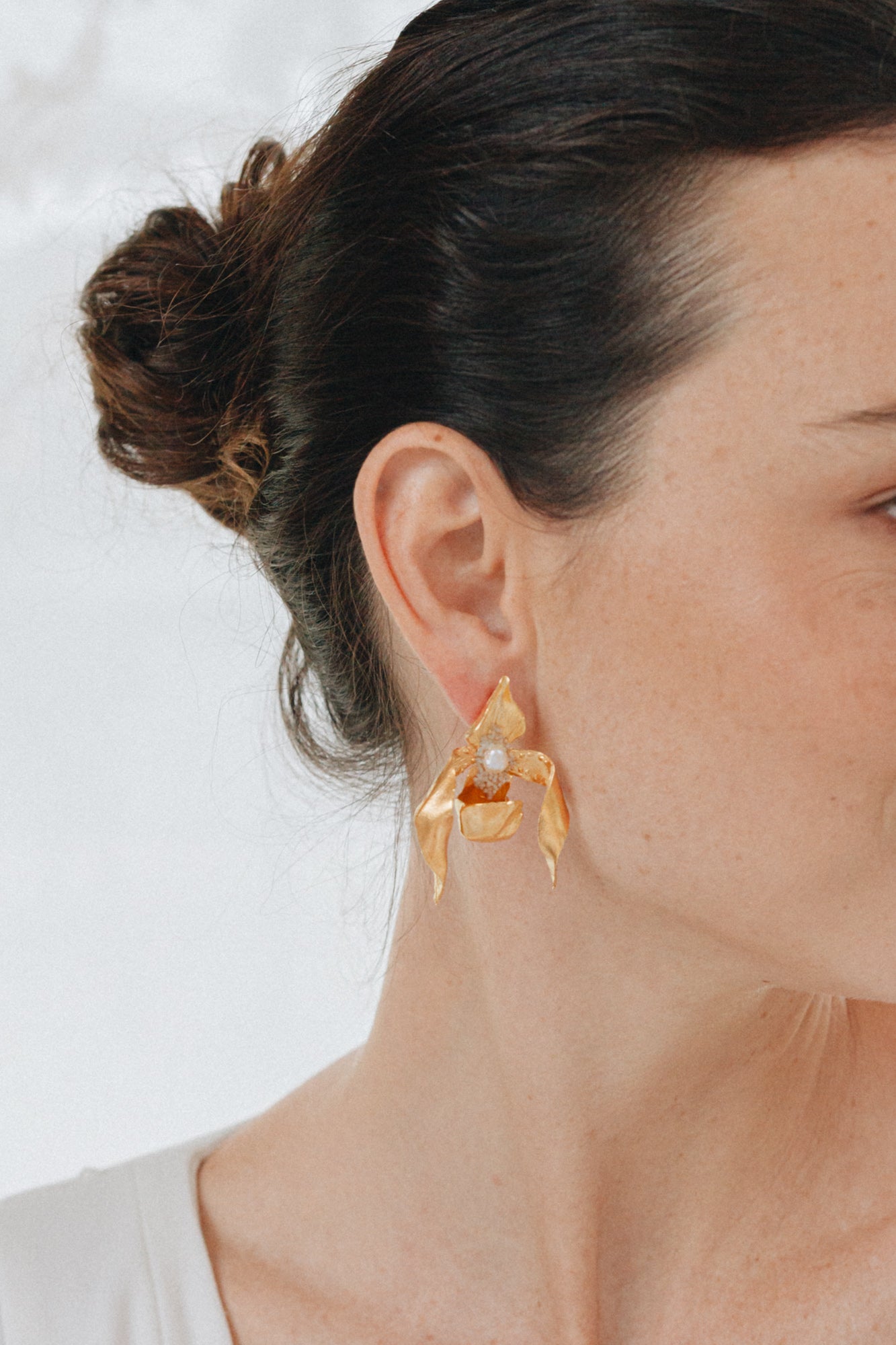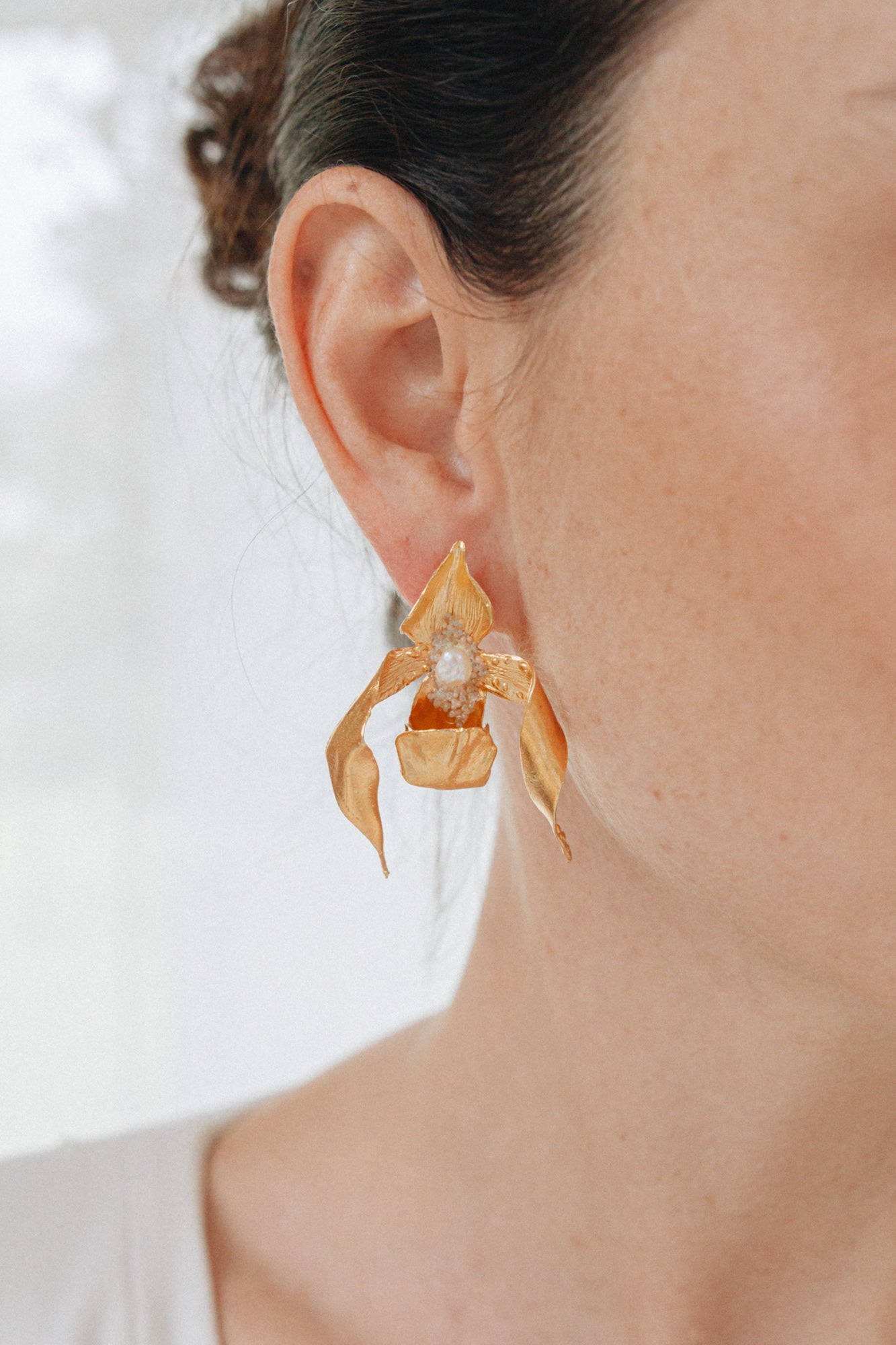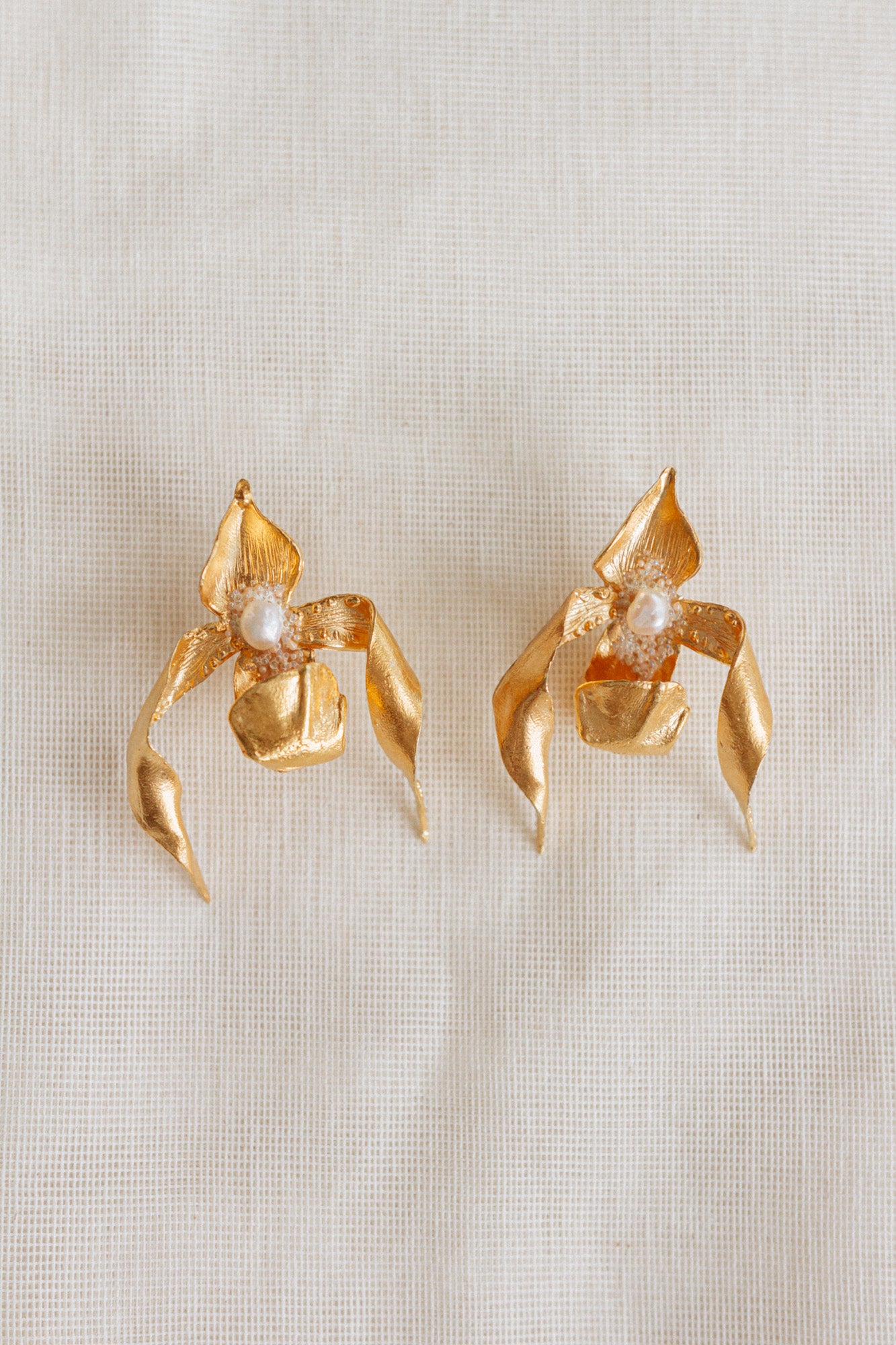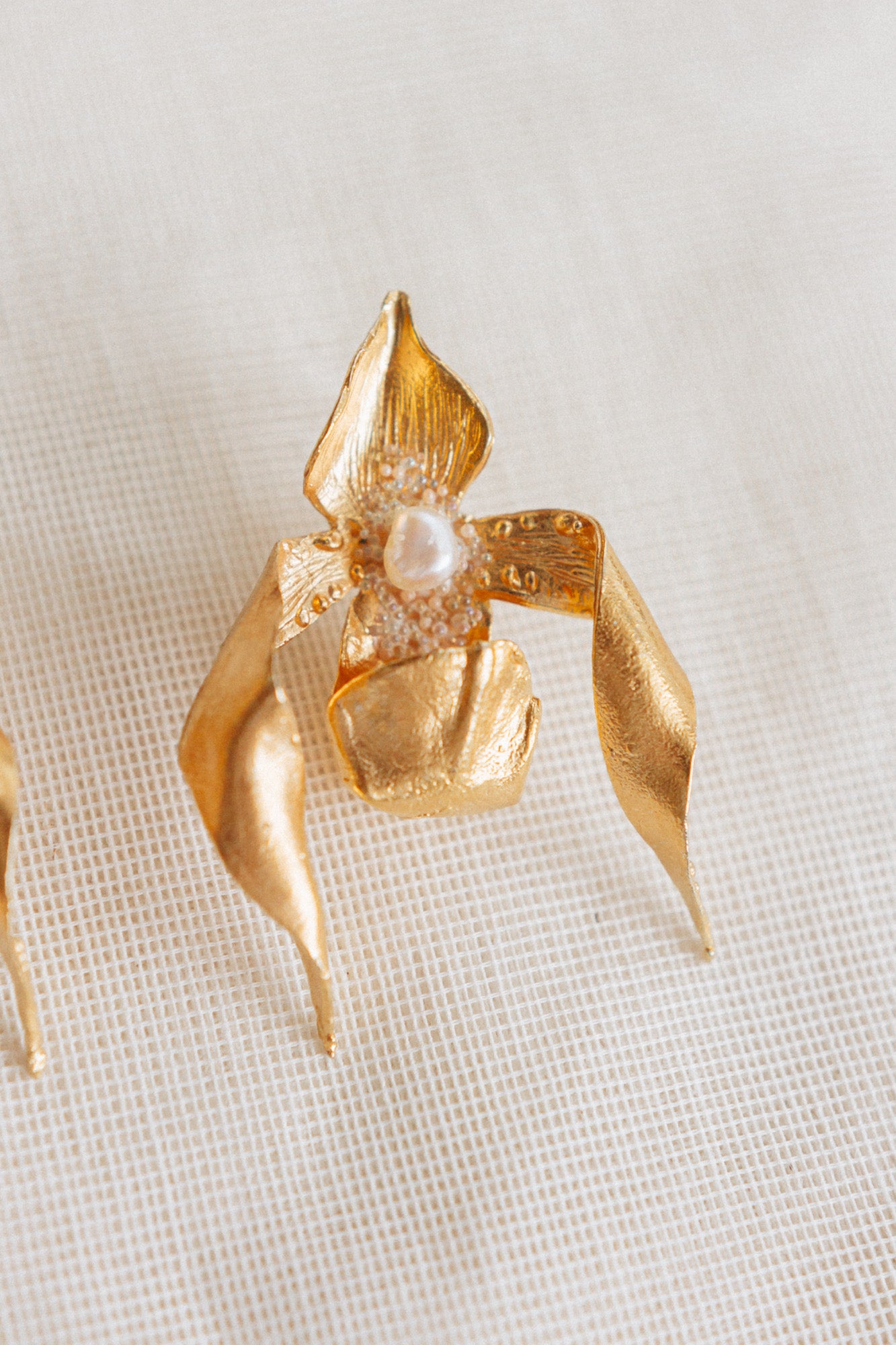 A. Gold plated bronze, hand painted with glass granulation and pearls.