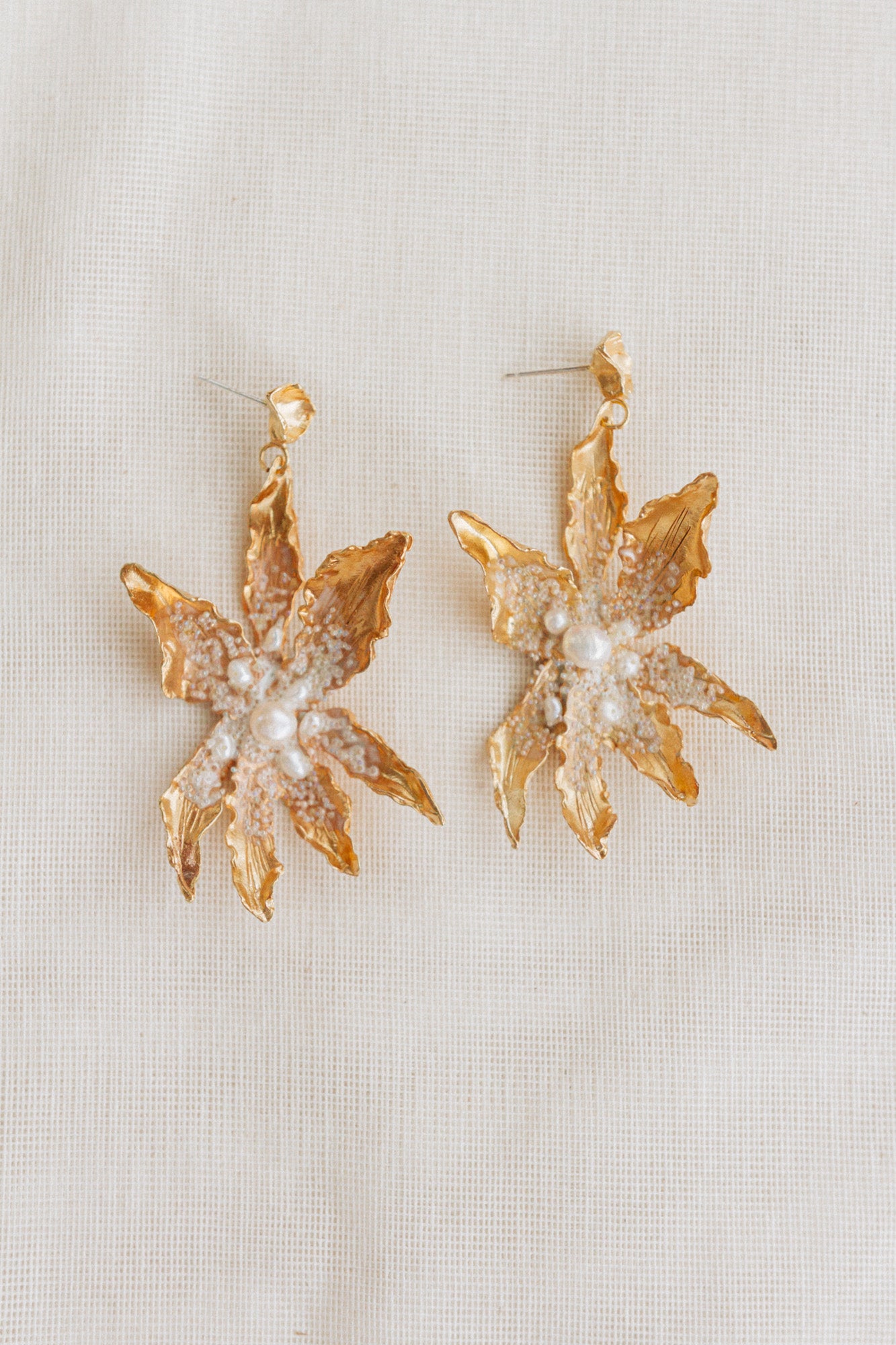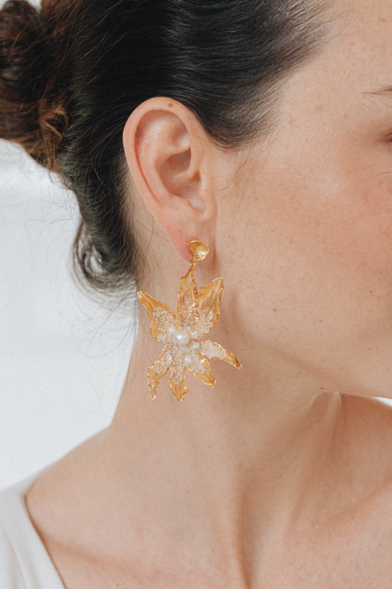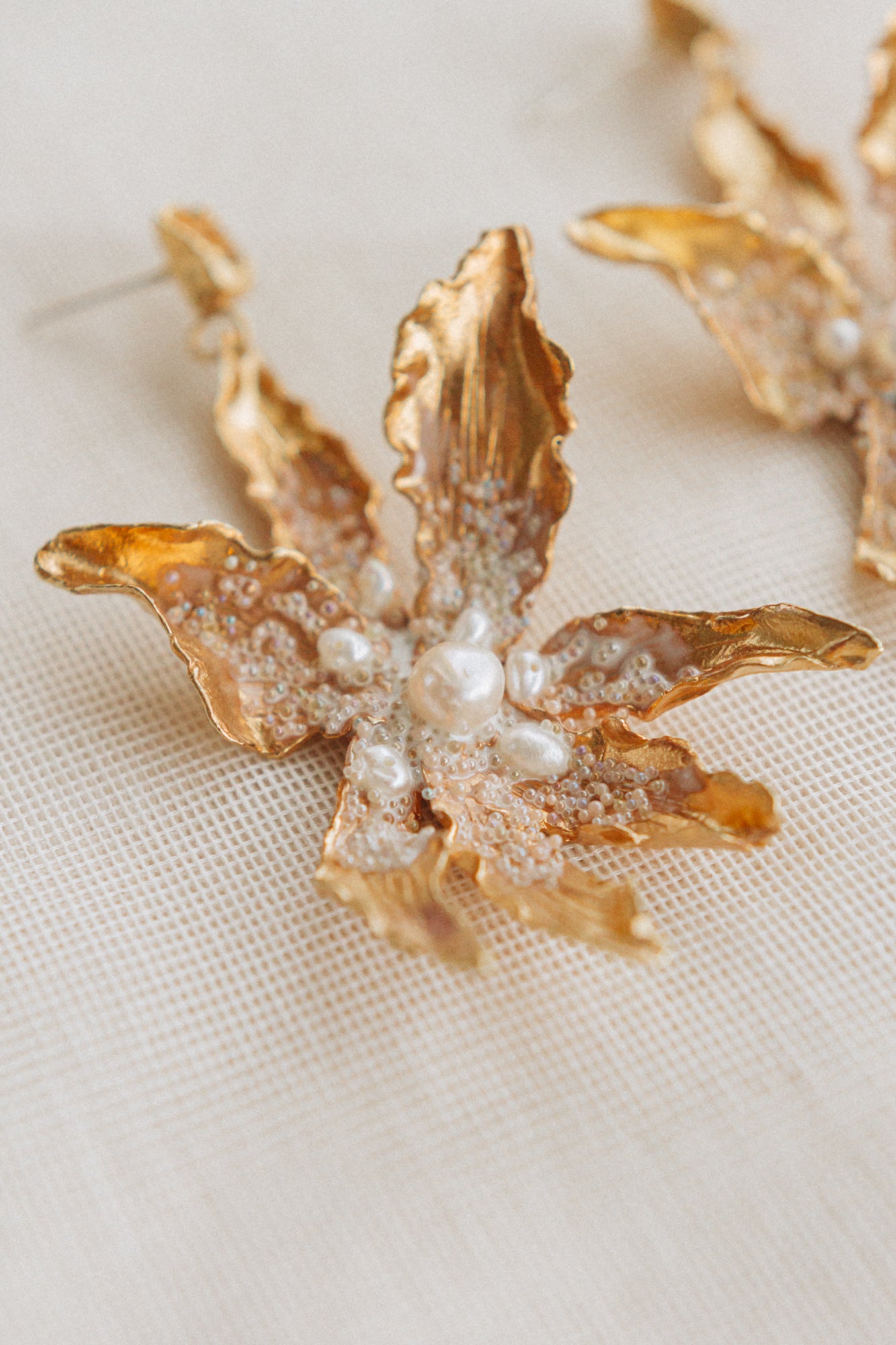 A. Gold plated bronze, hand painted with glass granulation and pearls.